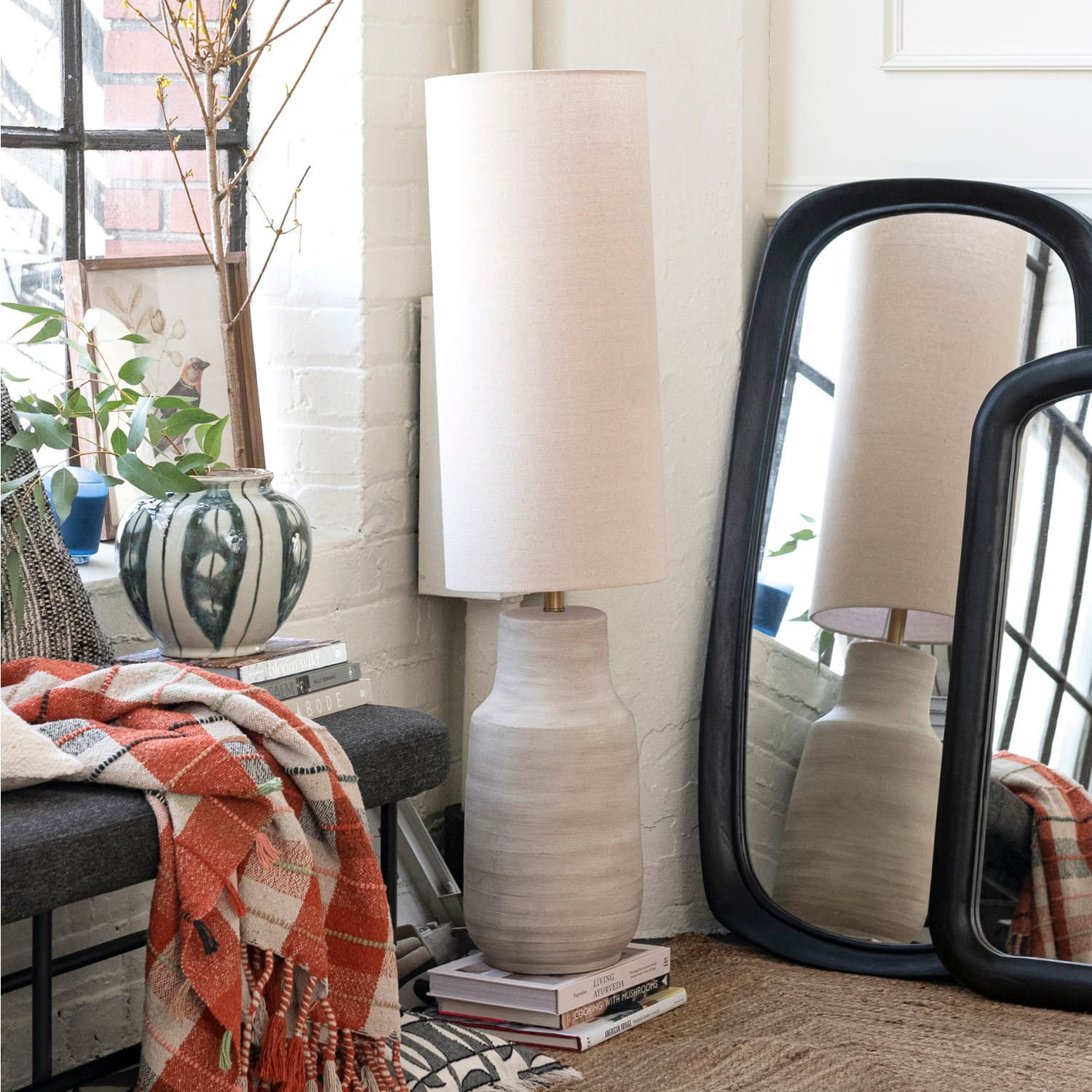 Hello Honey® 4ft. Sand Color Ceramic Floor Lamp with Linen Shade
