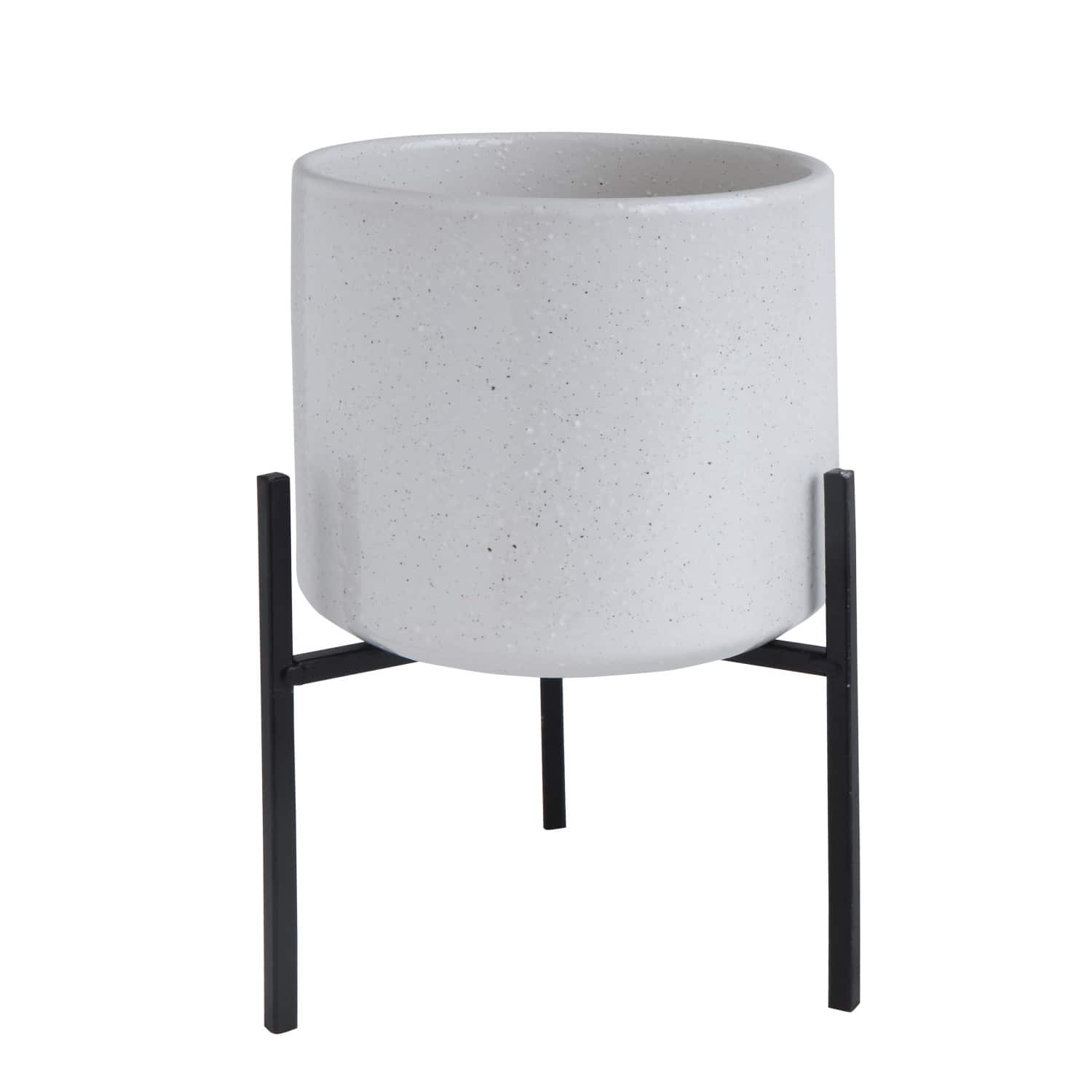 Hello Honey® 8" White Stoneware Flower Pot with Black Metal Stand