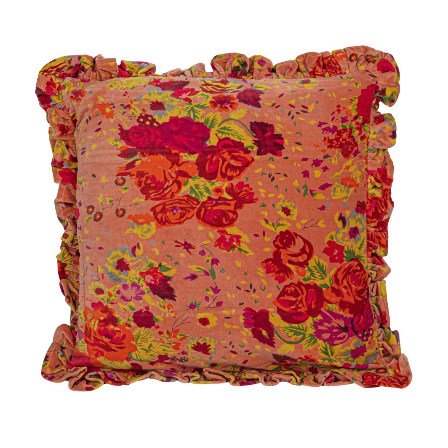 Hello Honey® Red Floral Printed Chambray Back & Ruffle Cotton Velvet Pillow
