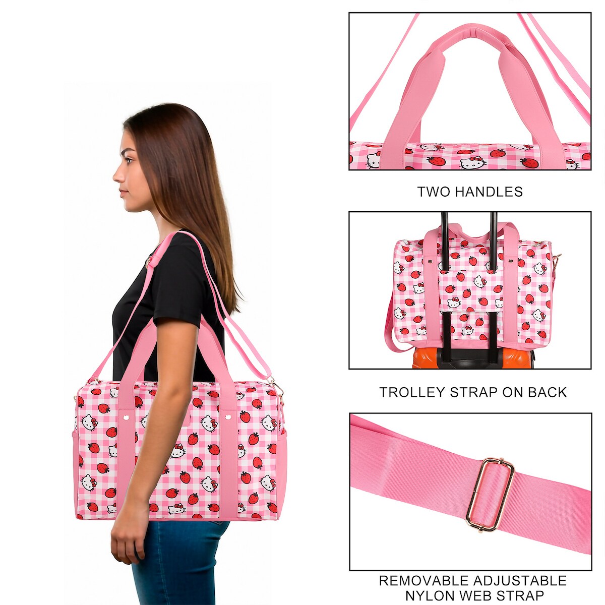 Hello Kitty Character & Strawberries All-Over Print Pink Plaid 20" Duffel Bag