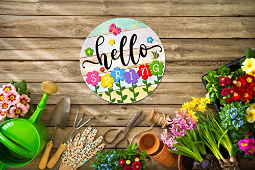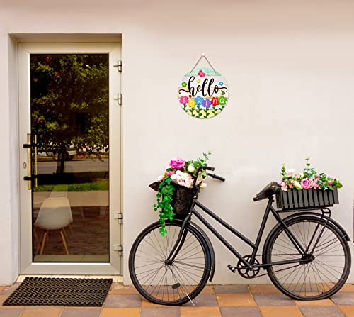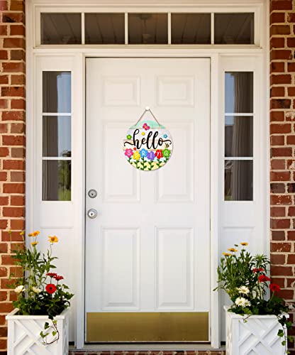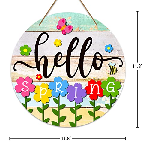 Hello Spring Door Sign - 11.8" Colorful Flowers Welcome Decoration Wreath Farmhouse Hanging Sign for Home Front Door Wall Porch Indoor Outdoor Decor