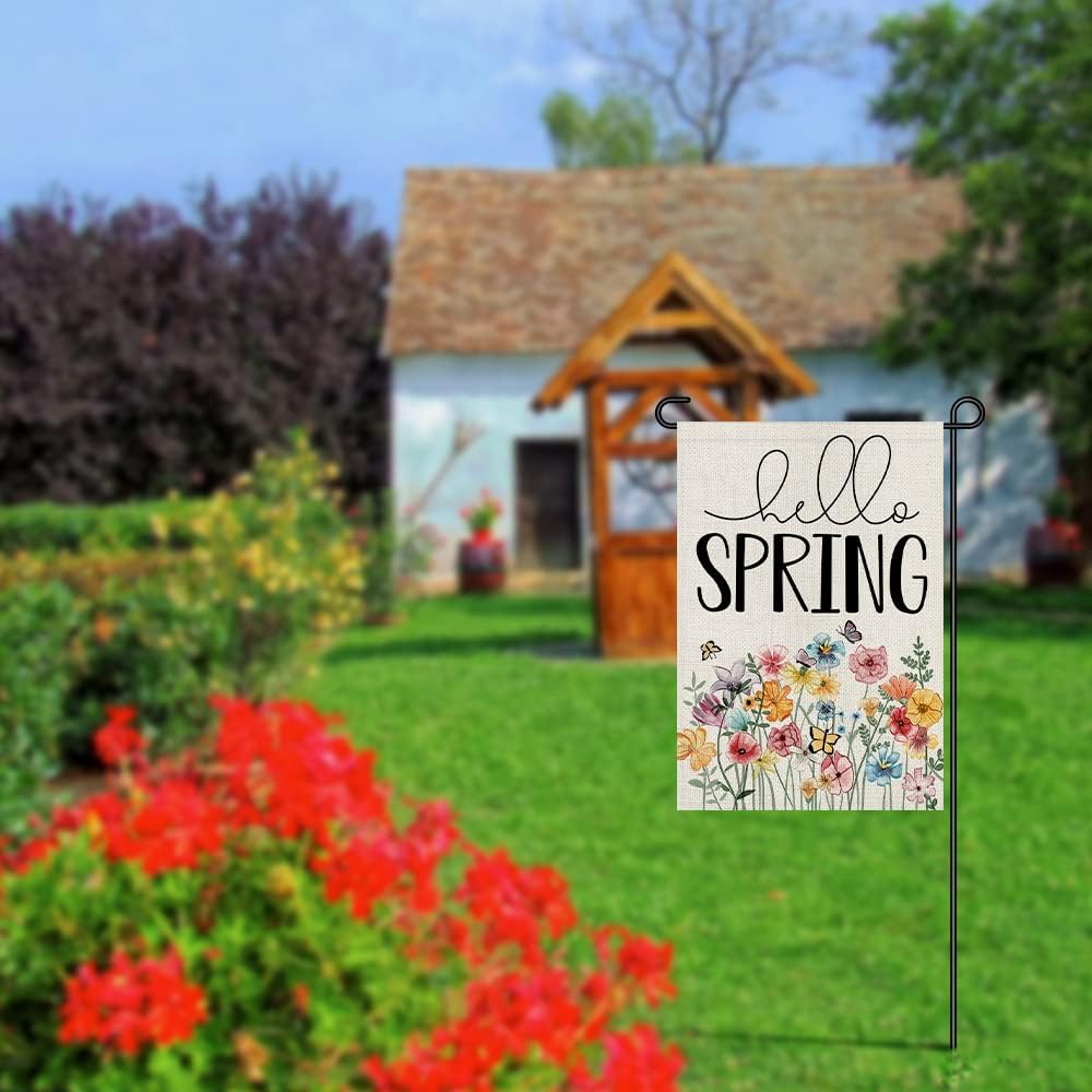 Hello Spring Floral Garden Flag 12x18 Inch Double Sided Burlap Outside, Flower Seasonal Sign Small Farmhouse Yard Outdoor Decoration