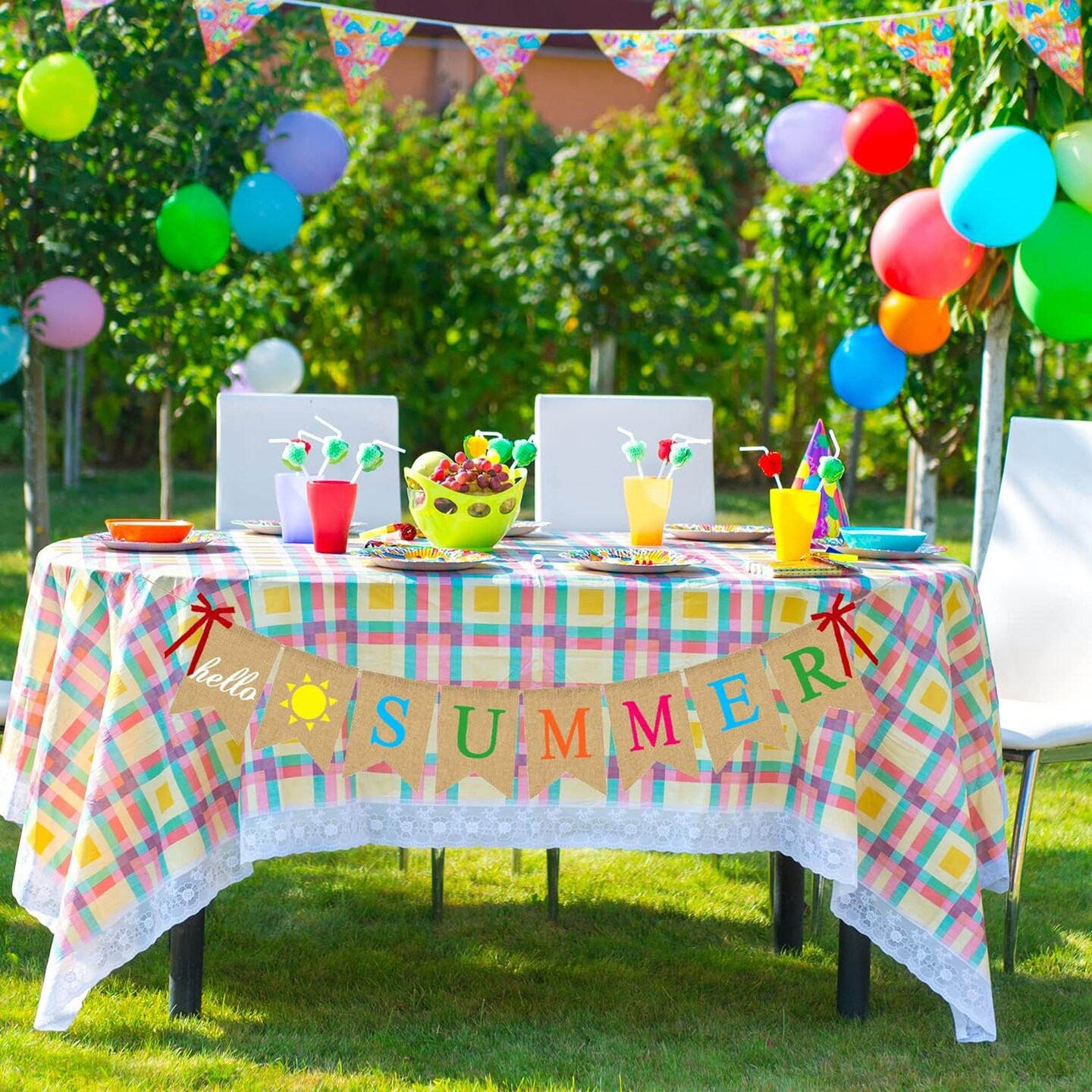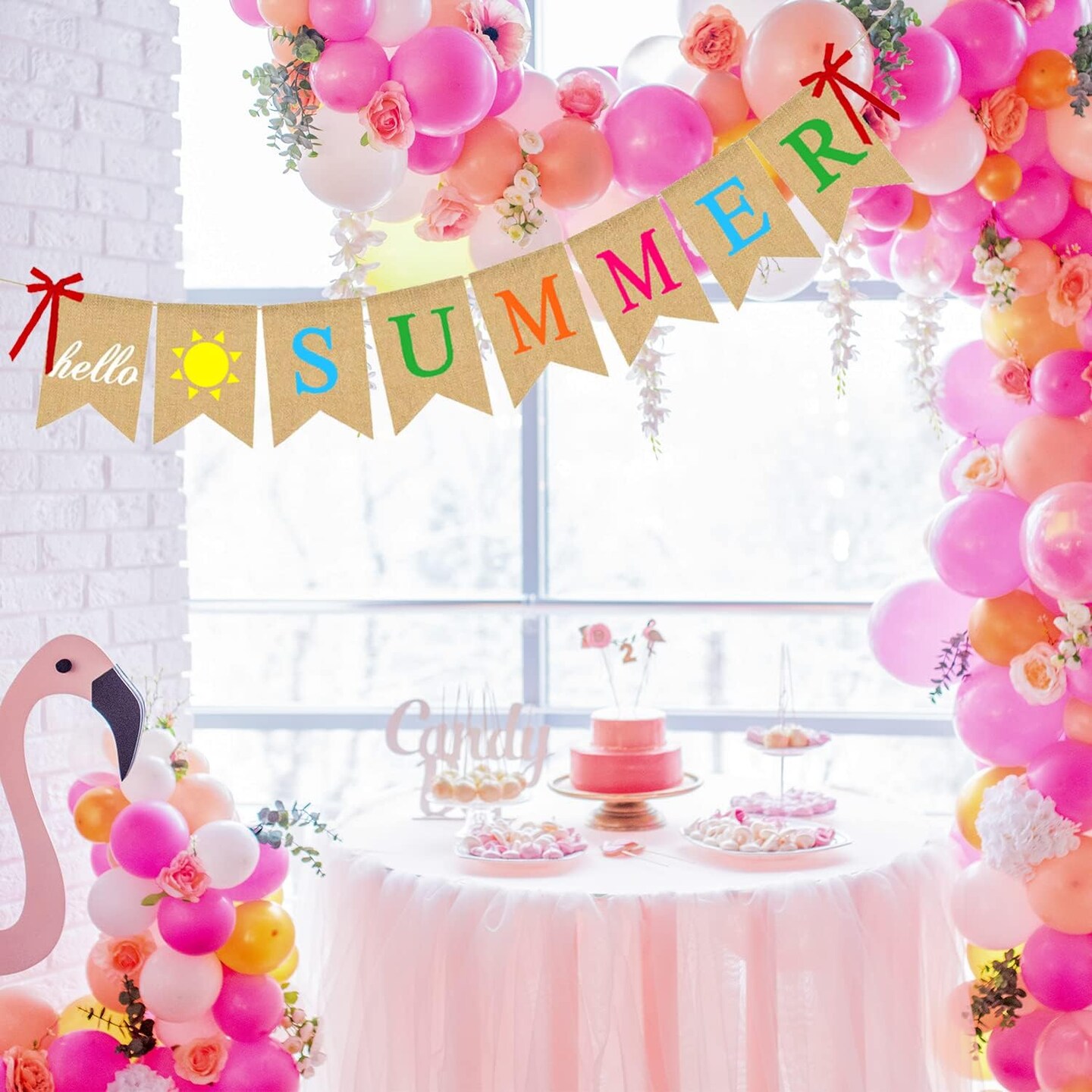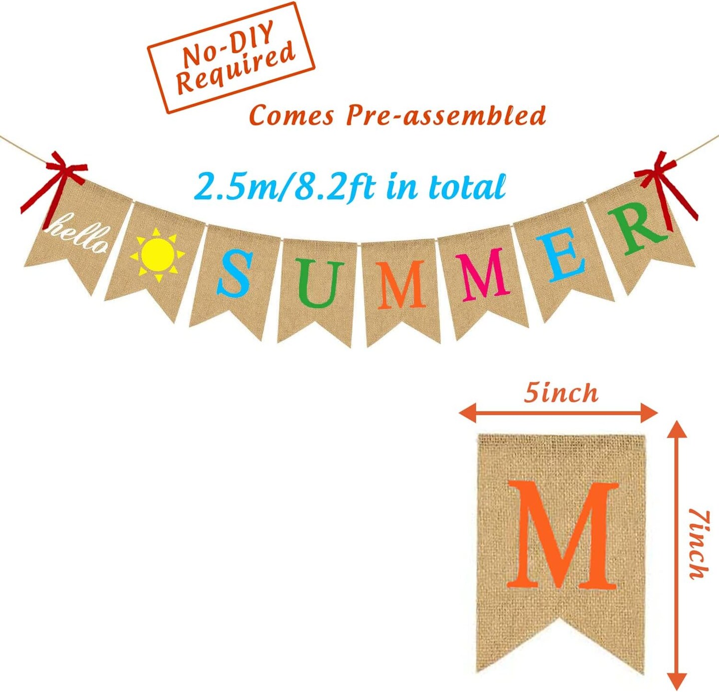 Hello Summer Burlap Banner with Sunshine Signs and Bows Rustic Bunting Garland for Camp Pool Beach Barbecue Hawaiian Summer Party Decorations
