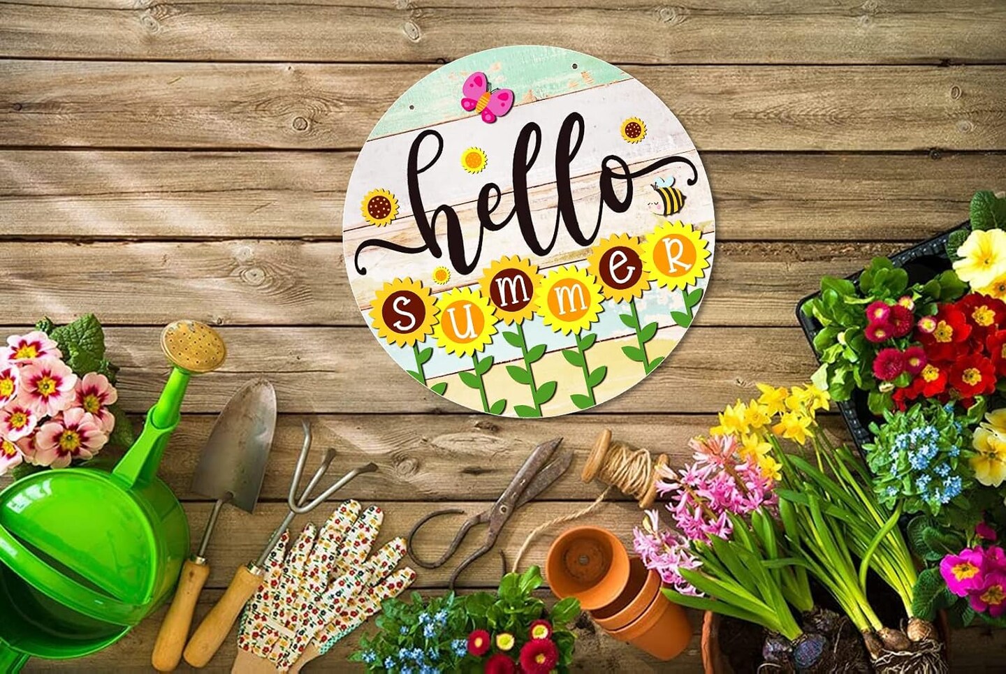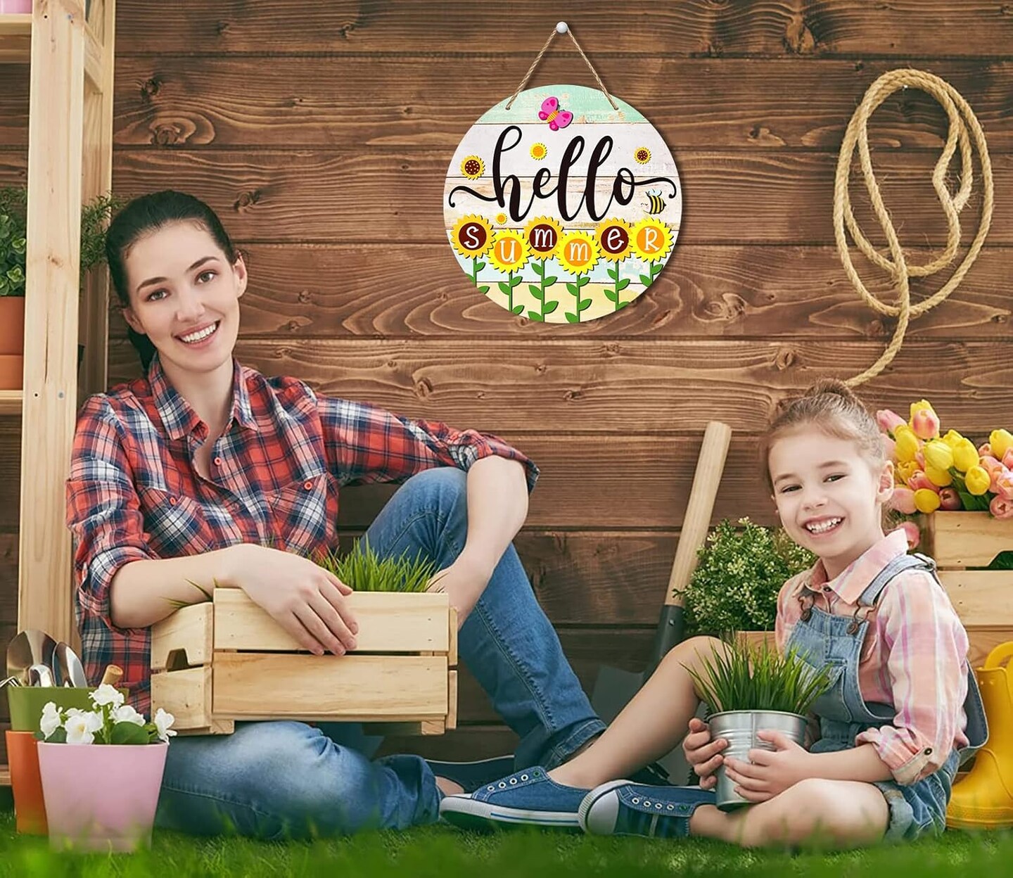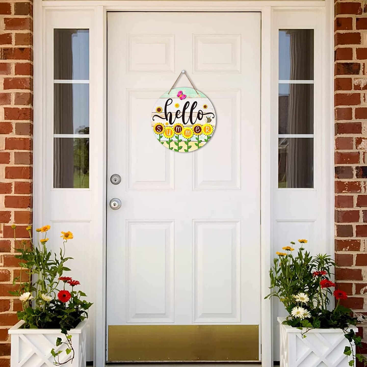 Hello Summer Door Sign: 11.8" Farmhouse Sunflower Summer Front Door Decor Sign Welcome Summer Hanging Sign for Home Wall Front Door Kitchen Office Decorations