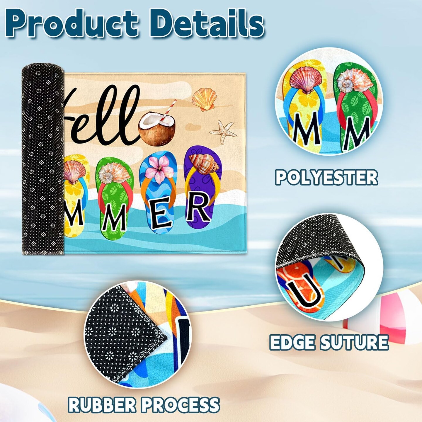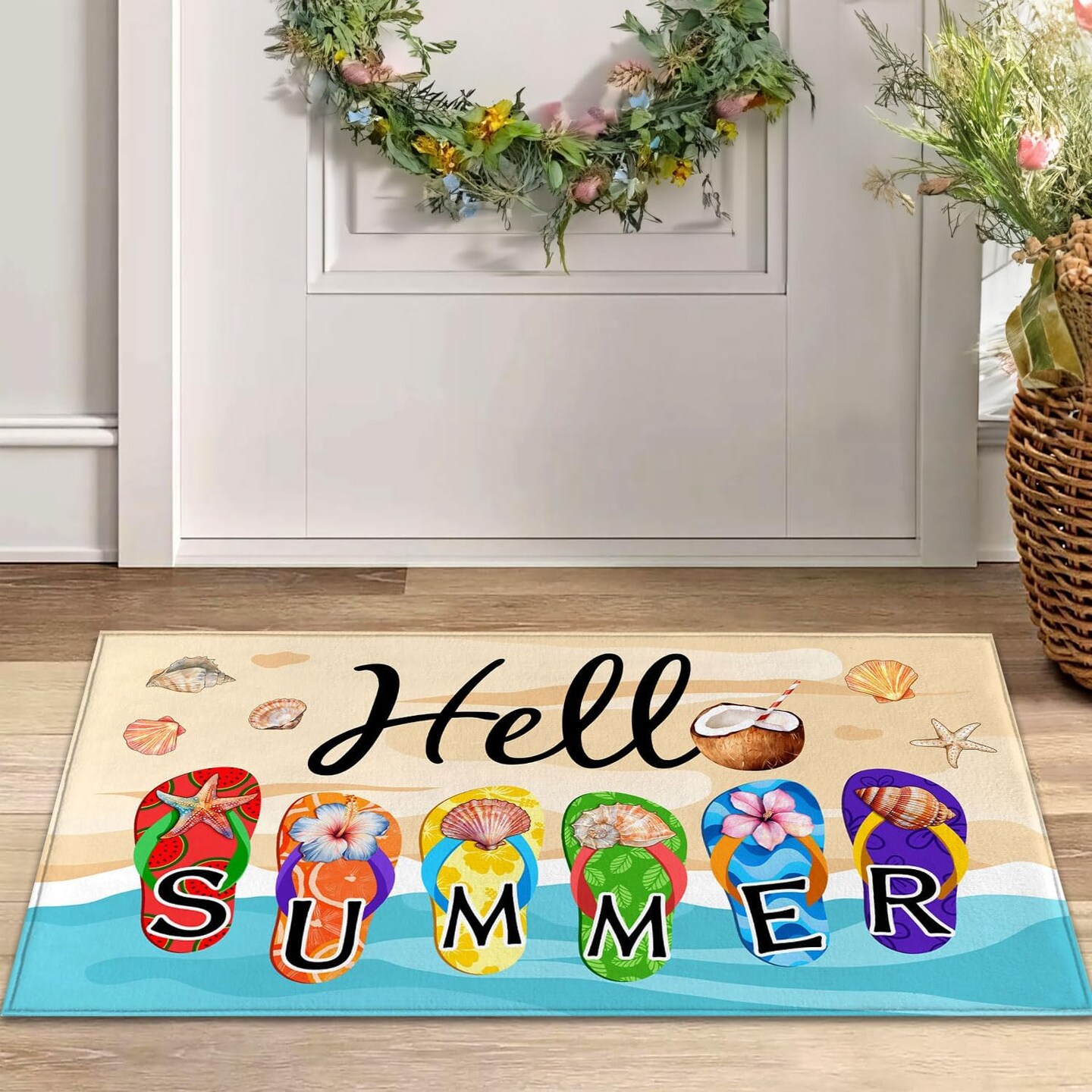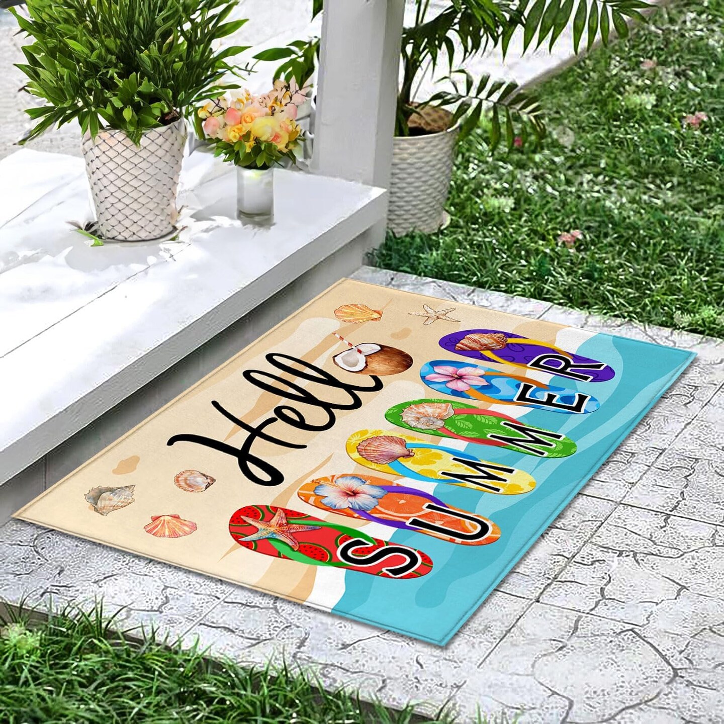 Hello Summer Doormat,Welcome Summer Flip Flops Decorative Door Mat,Non-Slip Rubber Backing Floor Mat Washable Seasonal Front Door Mat for Porch Decor, 29 x 17 Inch