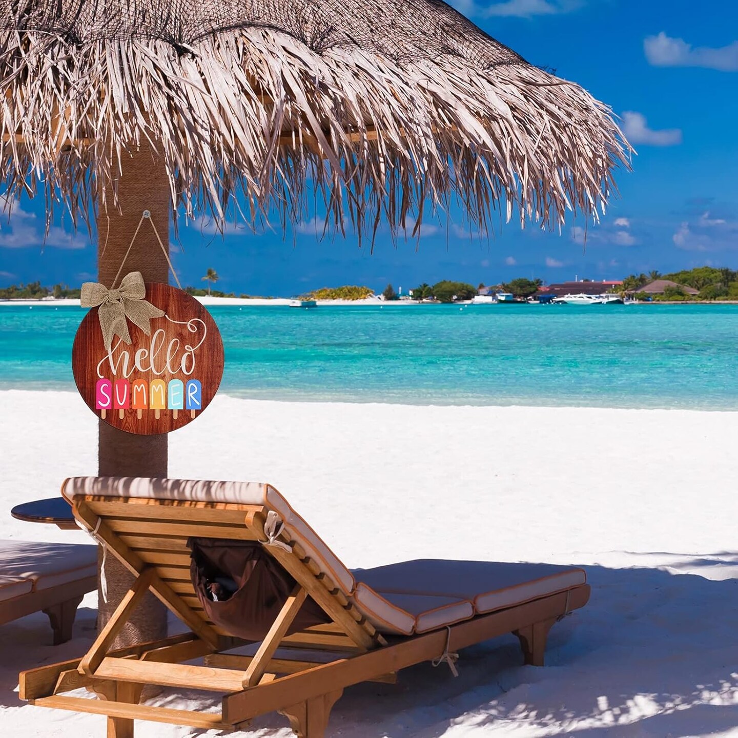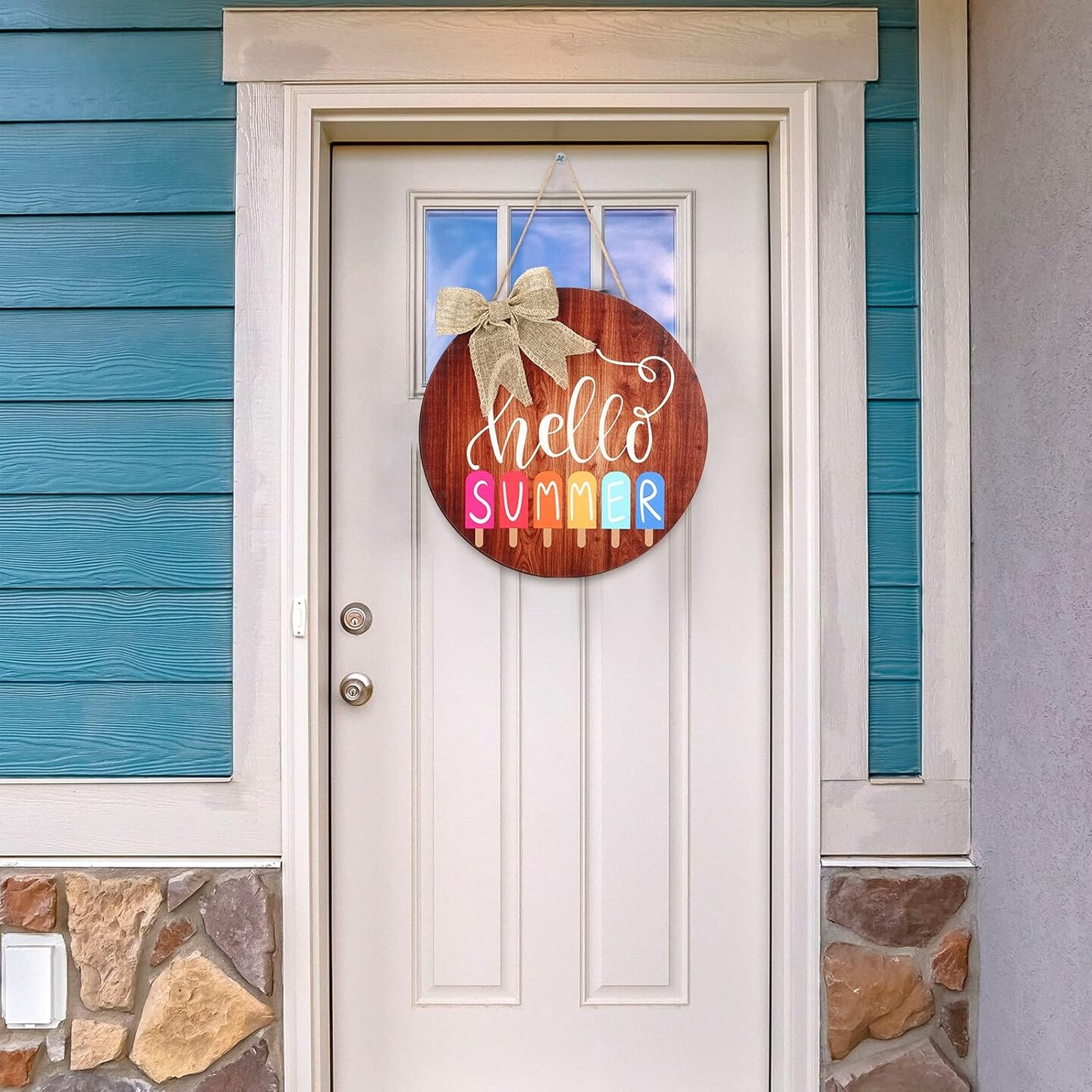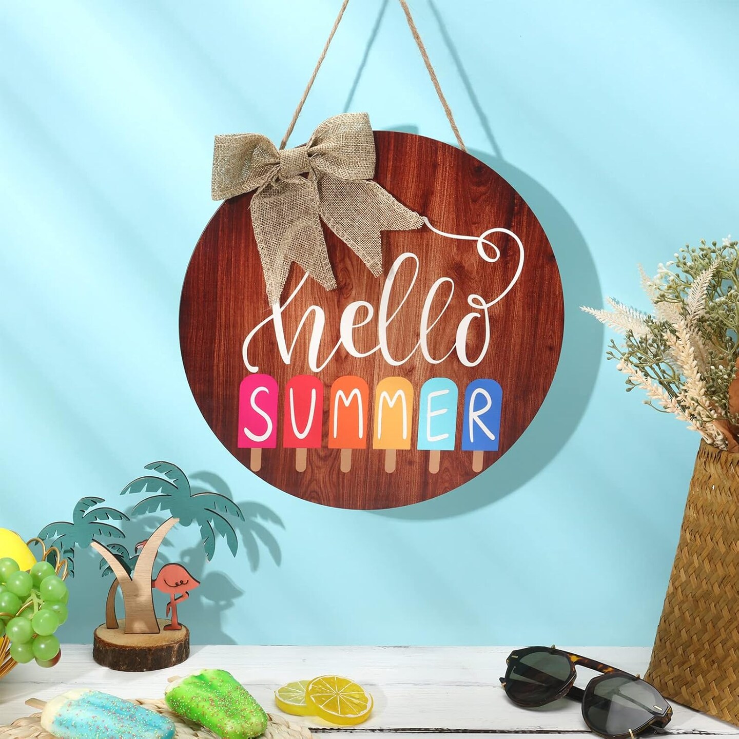 Hello Summer Sign 12 x 12 Inch Summer Welcome Sign Front Door Decor Farmhouse Porch Decoration Round Wooden Hanging Sign for Home Beach Restaurant Shop