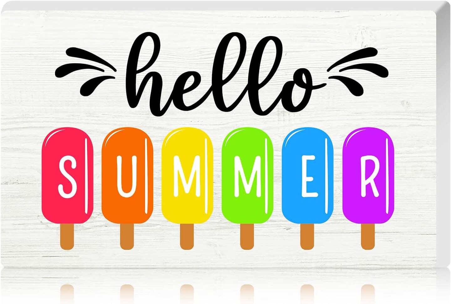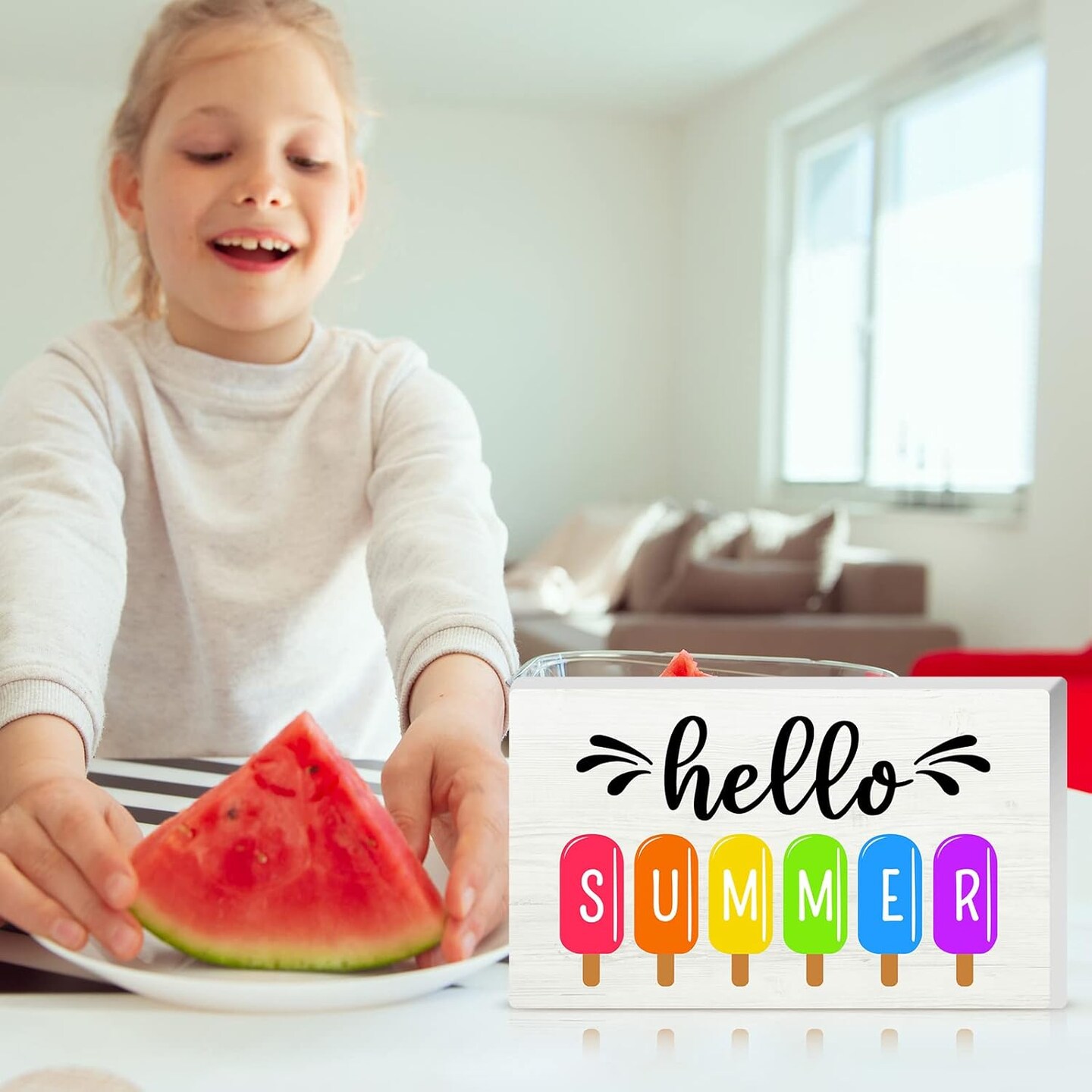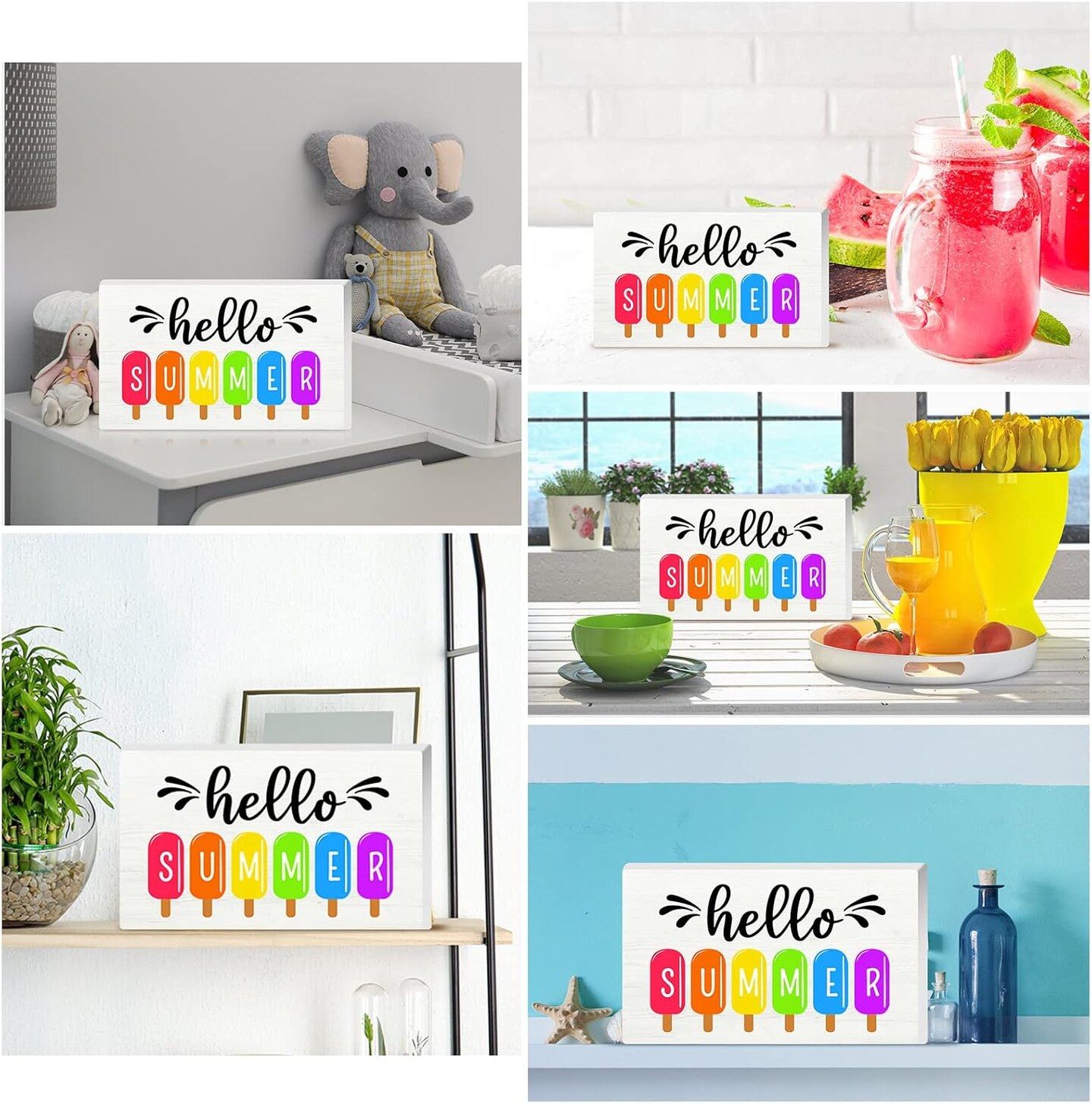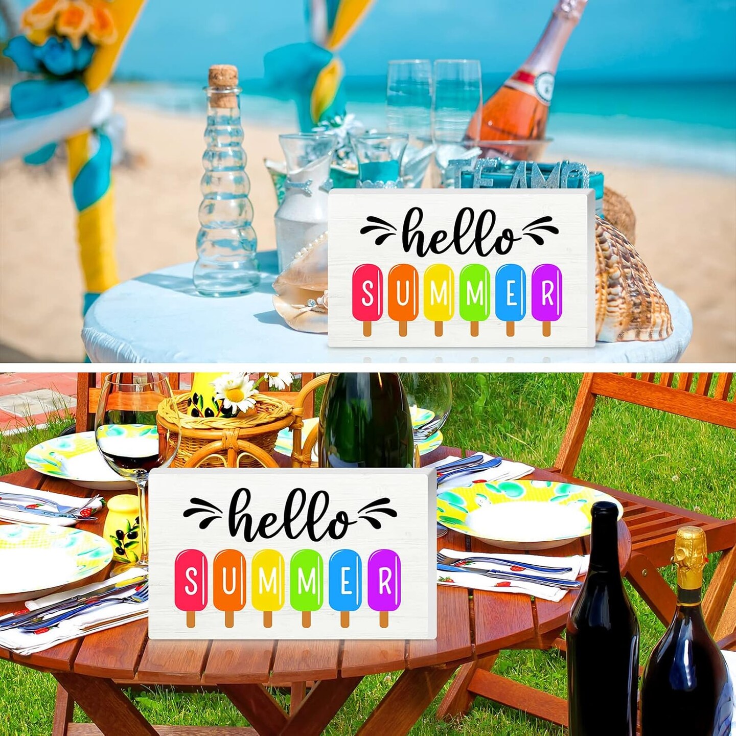 Hello Summer Wood Sign for Home Farmhouse Decor 9 x 5.5 Inch Summer Tabletop Centerpiece Freestanding Decor Wooden Cutout Decoration for Home Kitchen Counter Dining Room