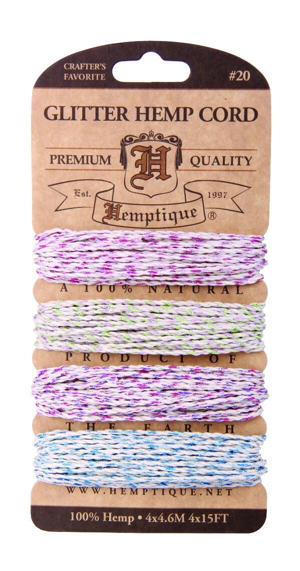 Hemptique 1mm #20 Variegated Metallic & Glitter Hemp Cord Card Set Eco Friendly Sustainable Naturally Grown Jewelry Bracelet Making Paper Crafting Scrapbooking Bookbinding Mixed Media Crocheting Macrame Seasonal Holiday Gift Wrapping Outdoor Garden
