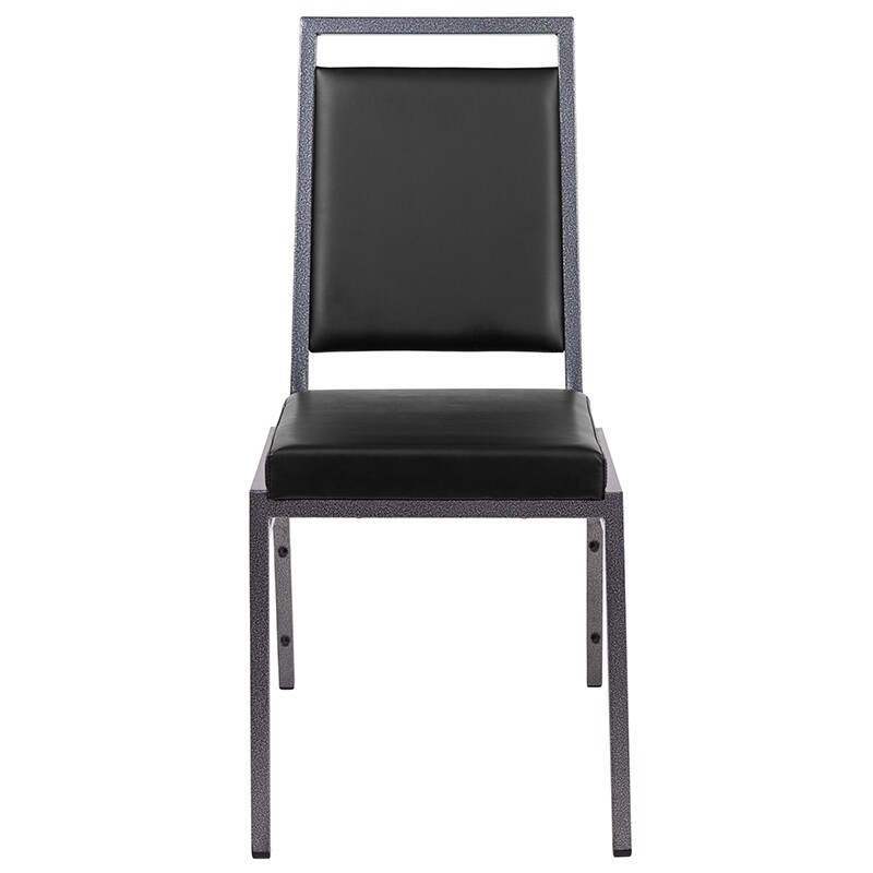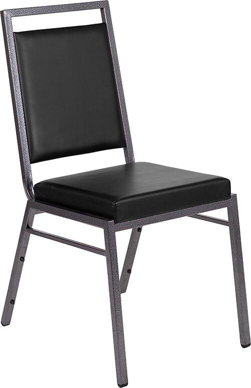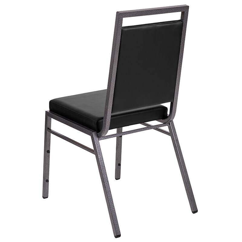 HERCULES Series Square Back Stacking Banquet Chair in Black Vinyl with Silvervein Frame