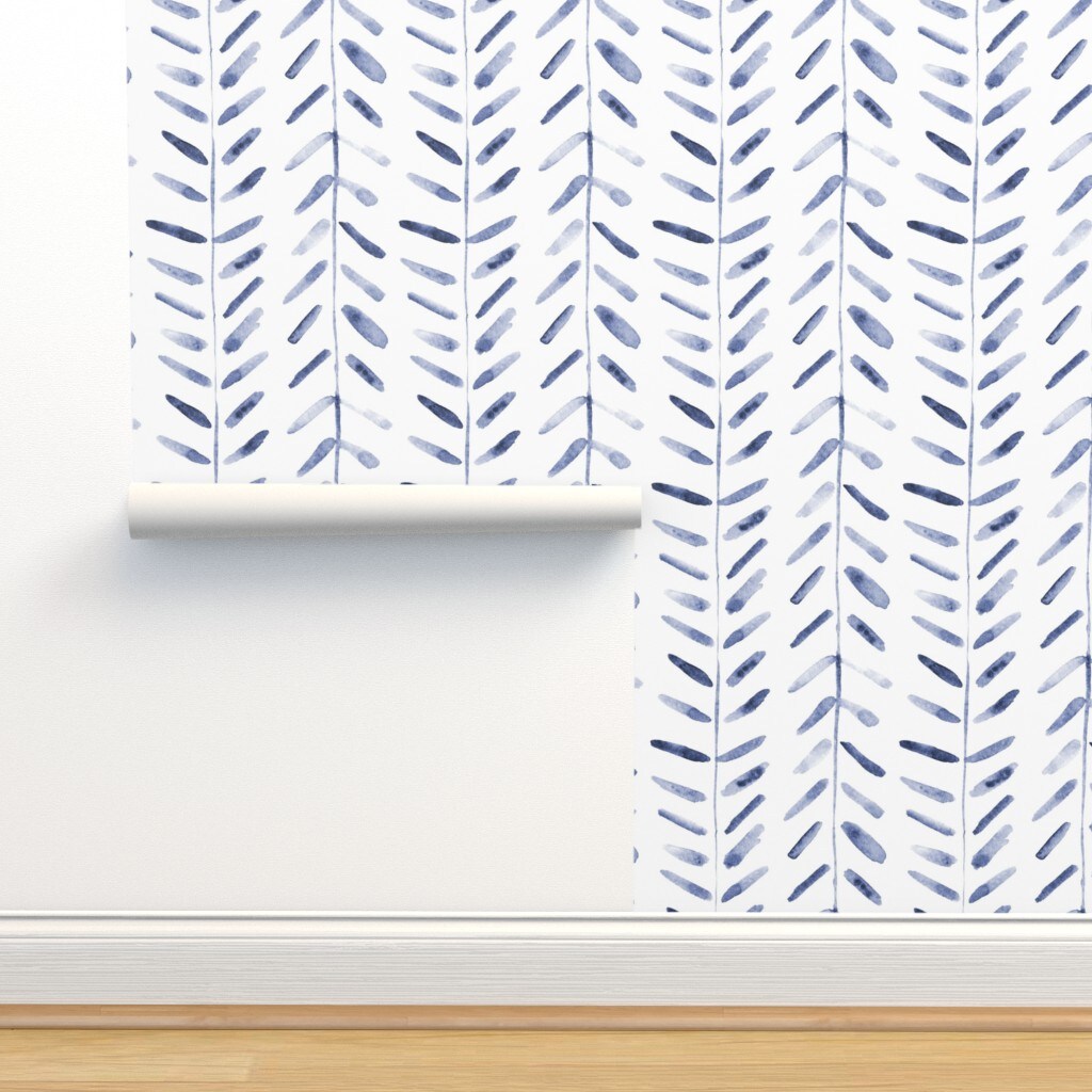 Herringbone Hand Drawn Painterly White Blue Shibori Inspired Geometric Indigo Large Scale Simple Basic Custom Removable Wallpaper by Spoonflower Peel & Stick Wallpaper 2FT Wide