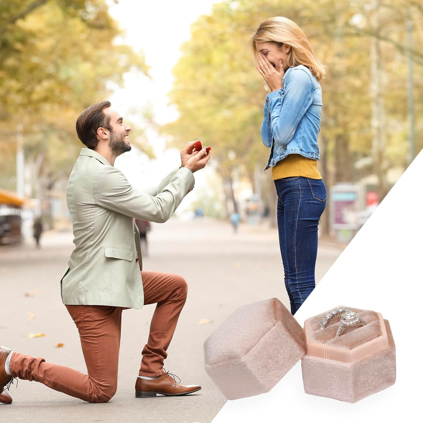 Hexagon Velvet 2 Slots Jewelry Storage Ring Box Engagement Ring Box Wedding Day Detachable Lid for Proposal Engagement Wedding Ceremony (Blush Peach)