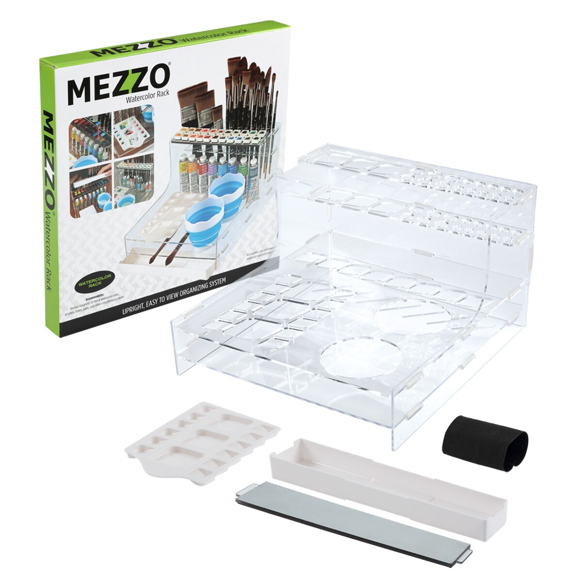 HG Art Concepts Mezzo Artist Studio Watercolor Rack - Watercolor Paint Brush Holder w/ Palette, Drip Pan and Magnetic Half Pan Storage, Organization System for 19 Brushes, Paint Tubes & More