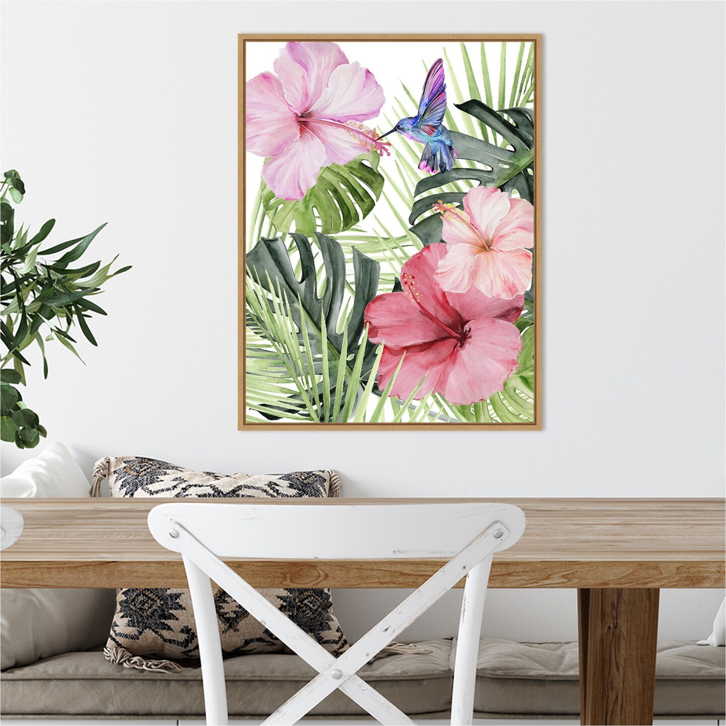 Hibiscus and Hummingbird I by Paxton Parker 18-in. W x 24-in. H. Canvas Wall Art Print Framed in Natural