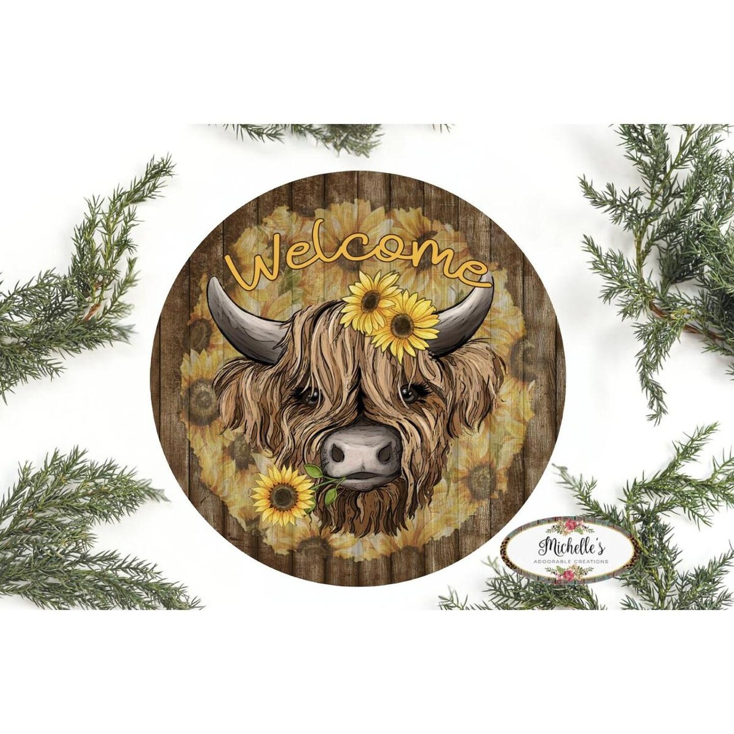 Highland Cow Welcome Sunflower Round Sign