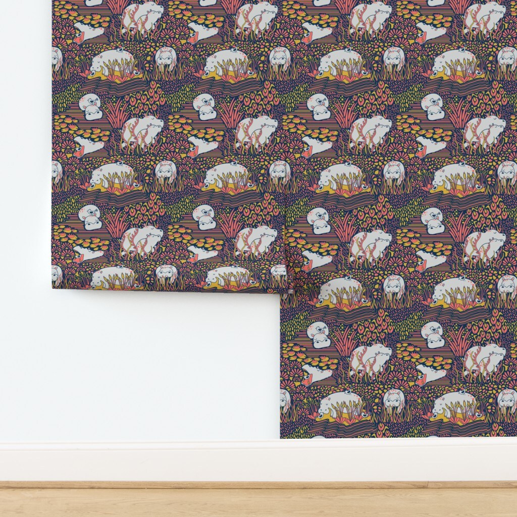 Hippo Hippopotamus Botanical African Bird Lily Pad Lotus Water Baby Animal Animal Navy Mustard Seaweed Coral Limited Color Palette Custom Pre-pasted Wallpaper by Spoonflower Pre-Pasted Wallpaper 2FT Wide