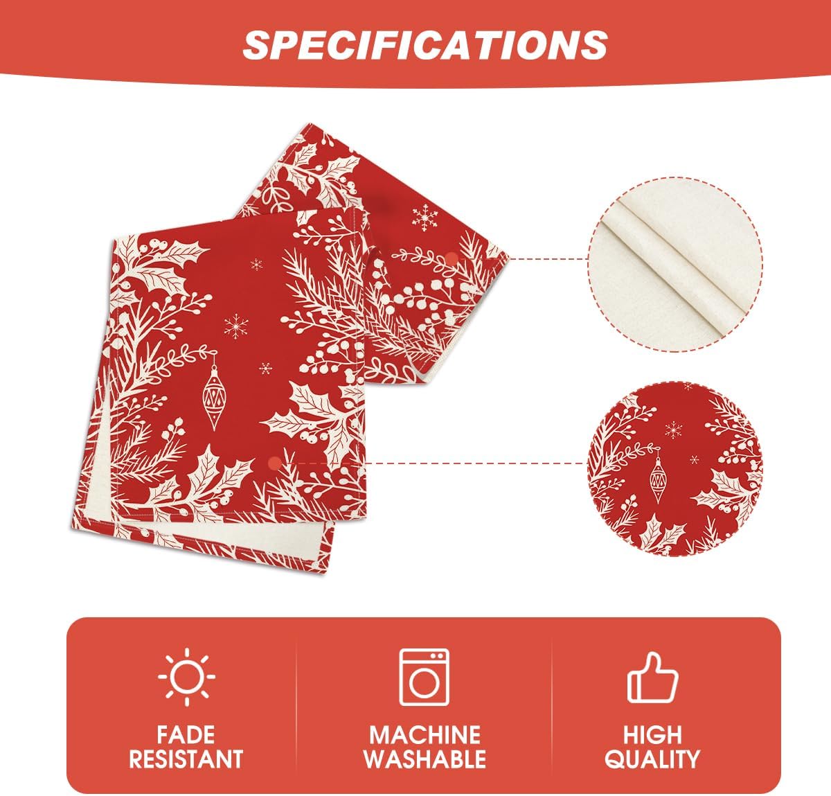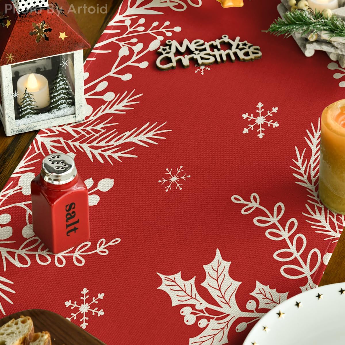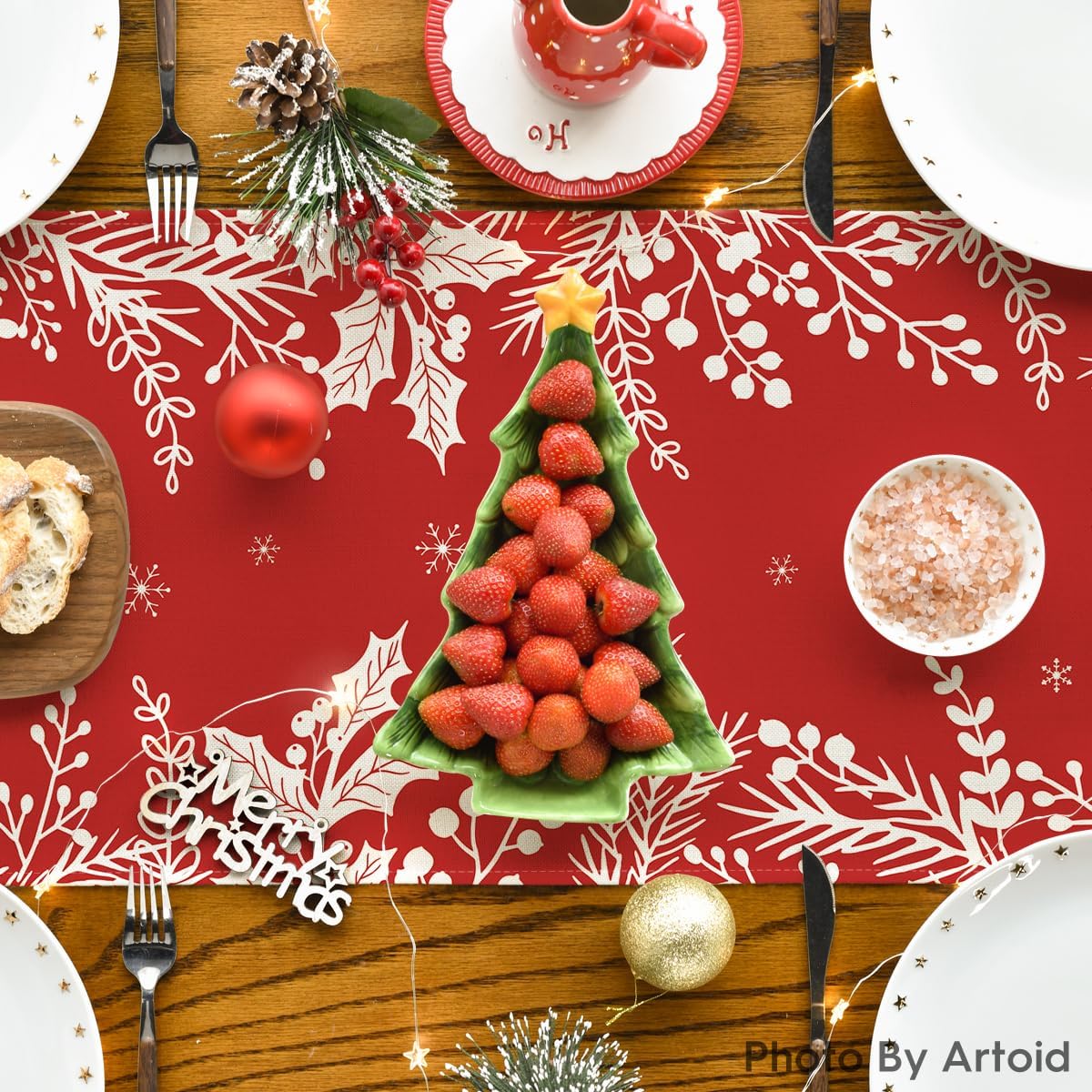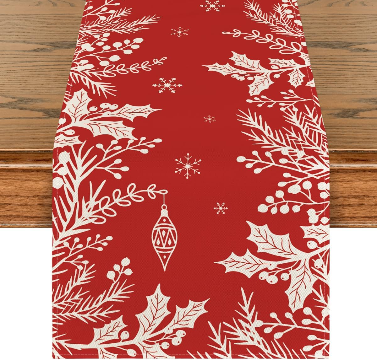 Holly Pine Branches Leaves Christmas Table Runner, Seasonal Winter Kitchen Dining Table Decoration