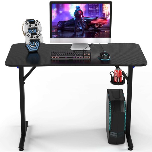 Home Office PC Computer Gaming Desk with LED Light and Gaming Handle Rack- Black