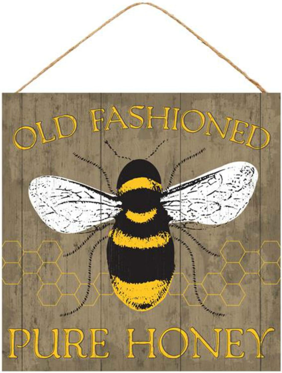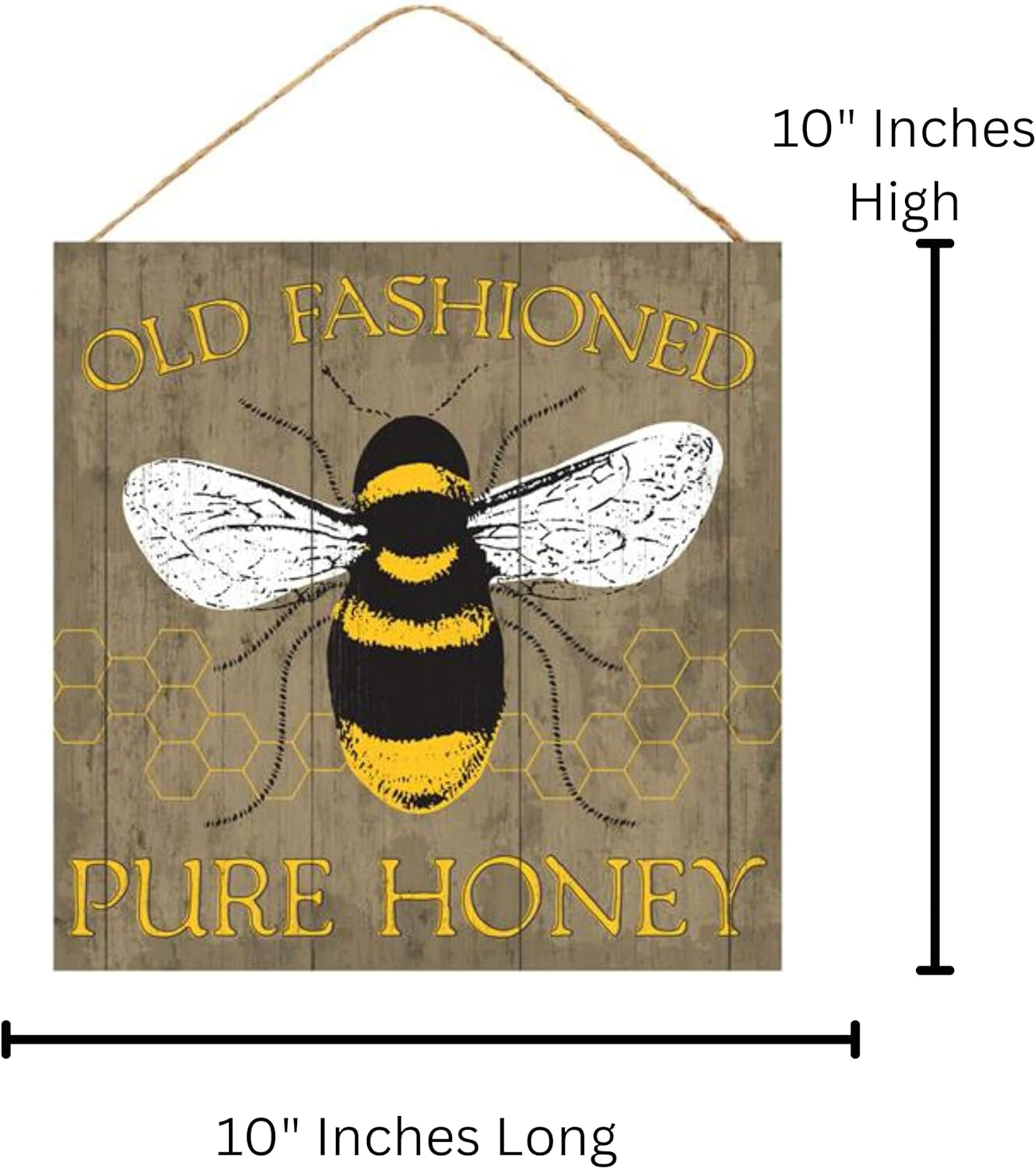 Honey Bee Sign - 10" Square, "Old Fashioned Pure Honey" Wall/Door Hanger, Wreath Accent, Craft or Decoration - Spring/Summer