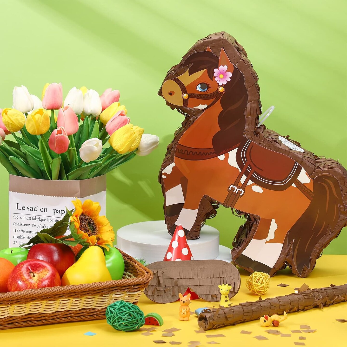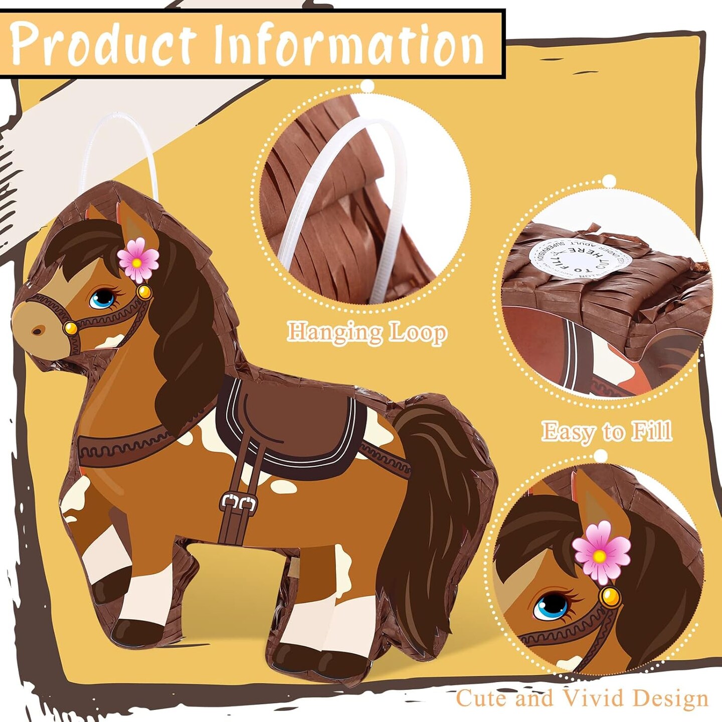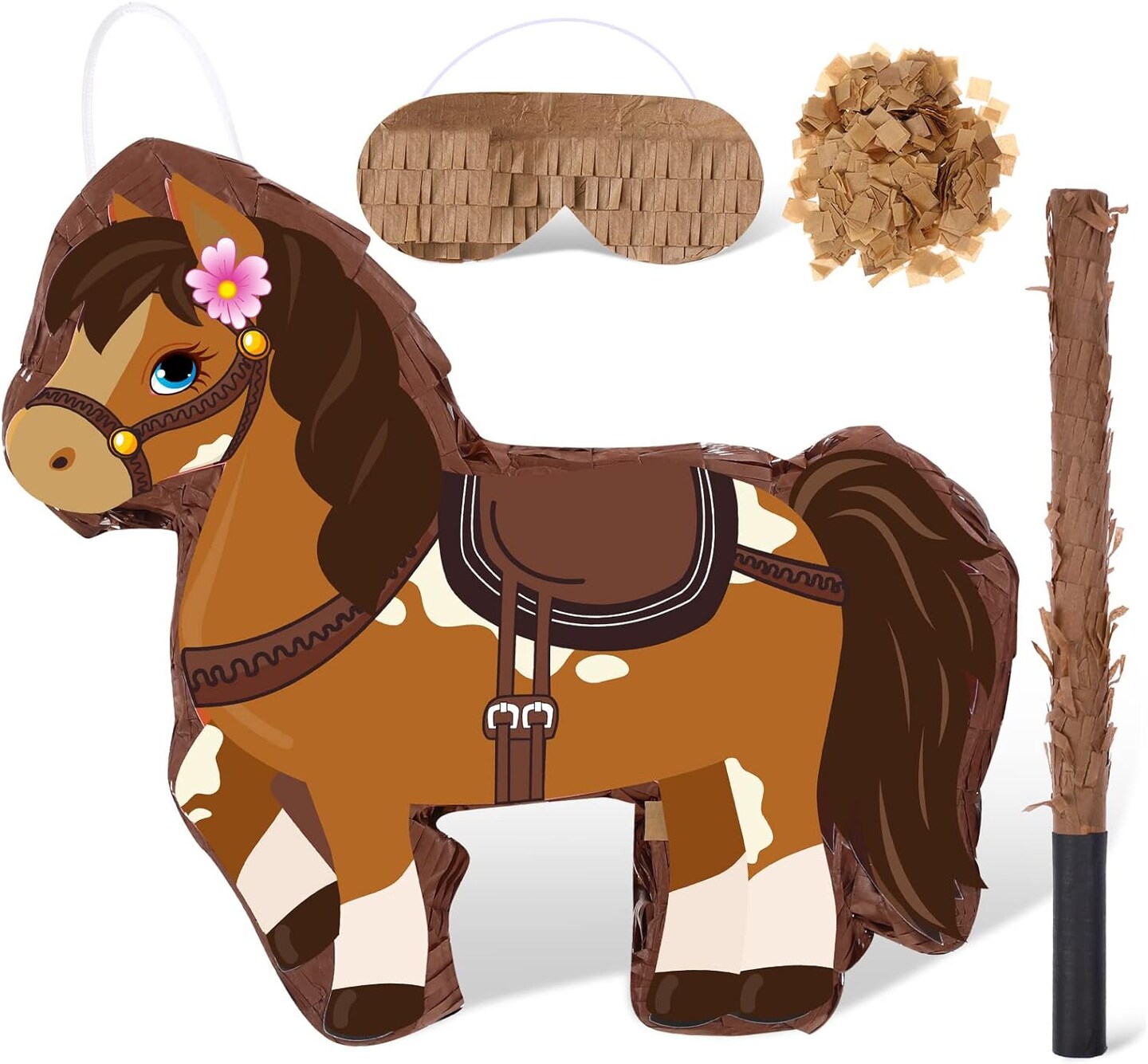 Horse Piñata Cowgirl Pinatas Brown Horse Piñata for Birthday Girl with Bat Stick Blindfold Mask for Horse Birthday Cowgirl Party Carnival Piñata Game Decor Supplies, 15 x 13.4 x 3.2 Inch