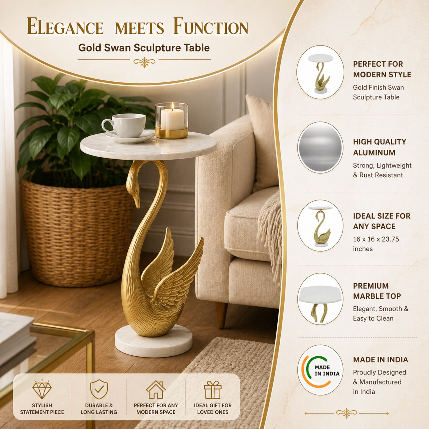 Horse Side Table with White Marble Top | Decorative Sculptural End Table | Aluminum Base | Gold Accent Table for Living Room | 16x16x23.75"