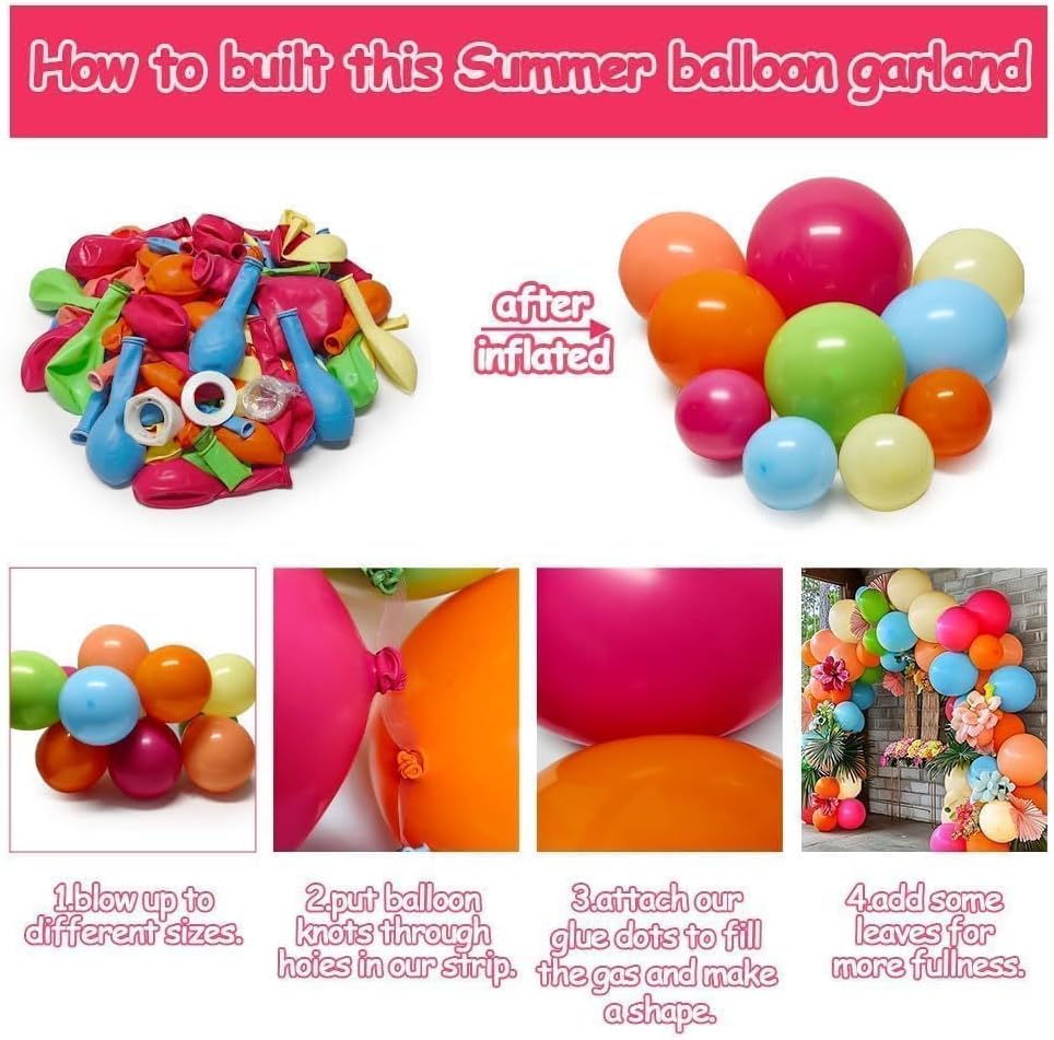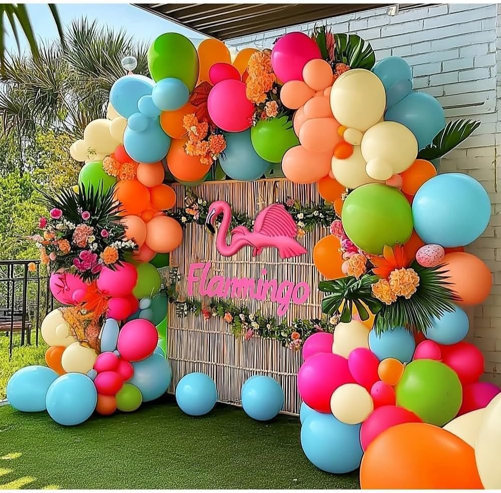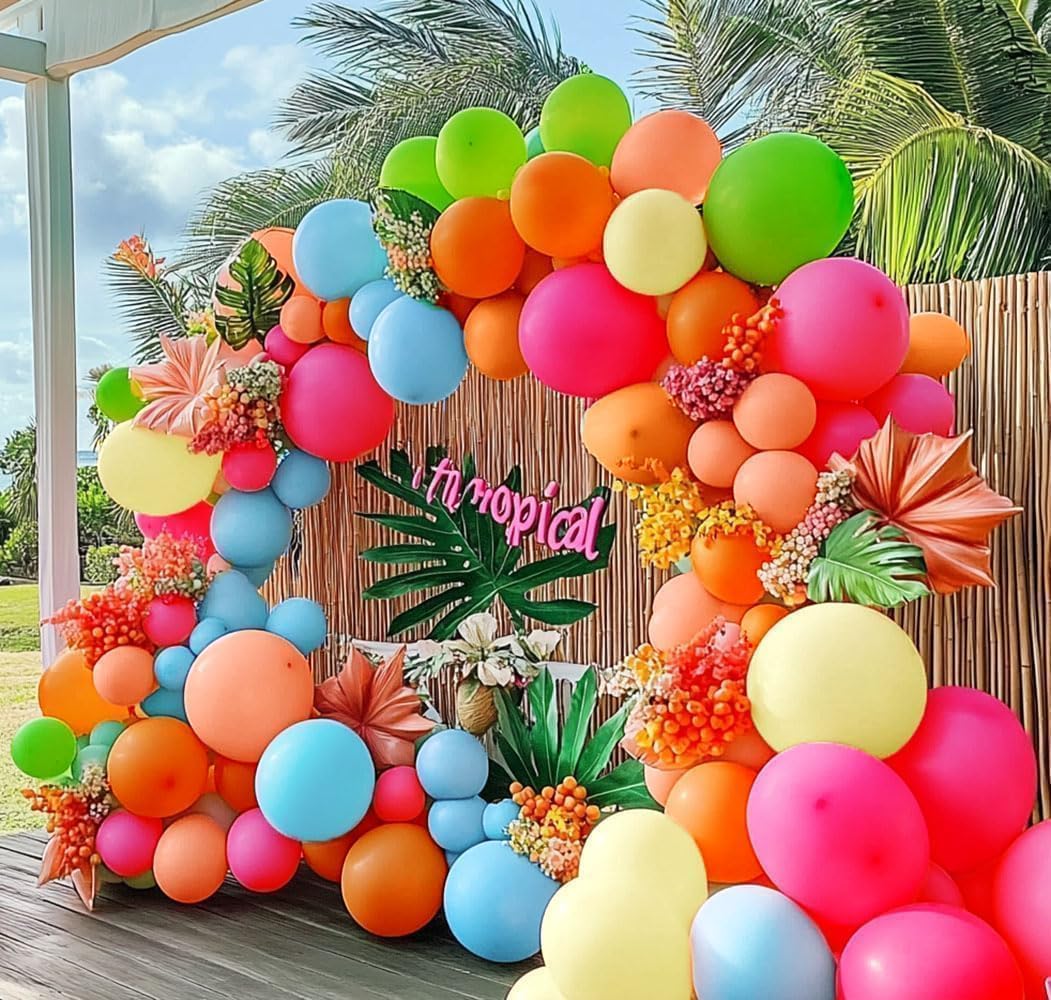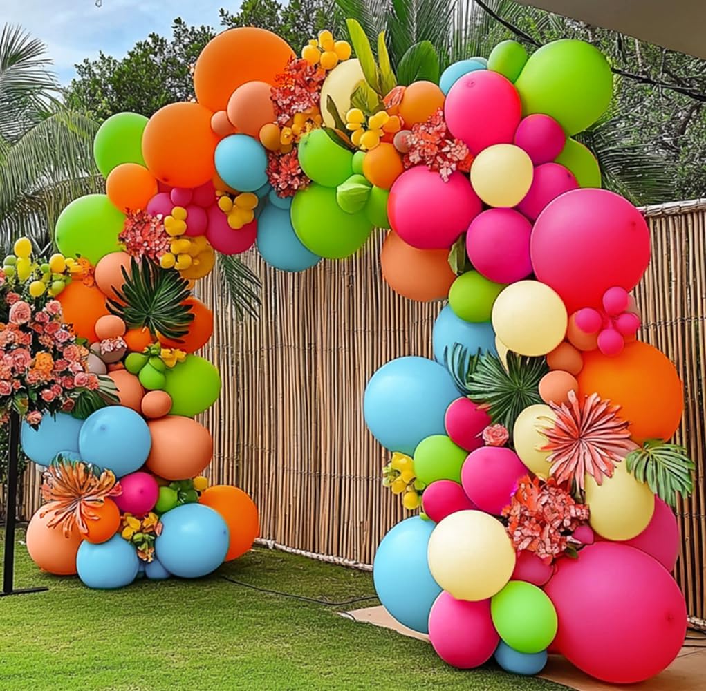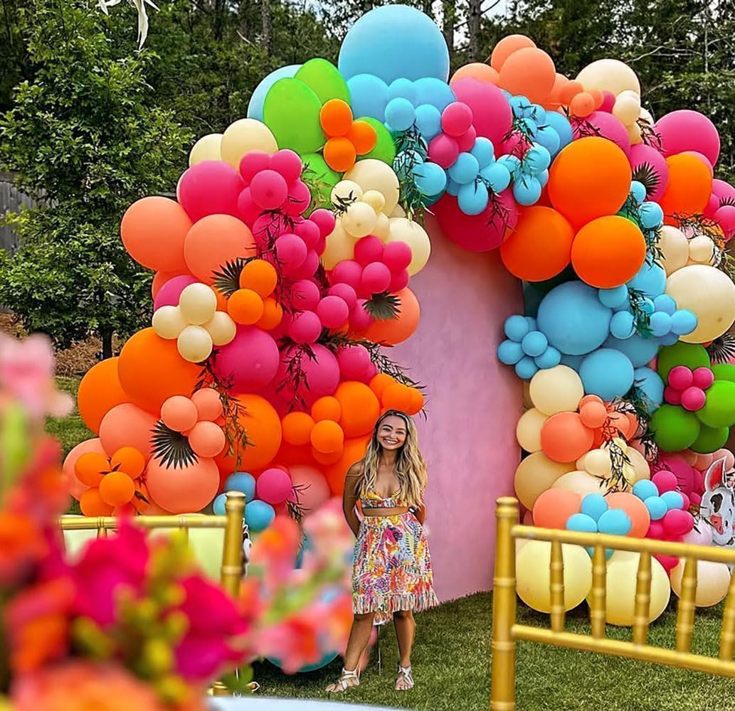 Hot Pink, Orange & Blue Balloon Garland – Double-Stuffed Pink, Green, Yellow, Peach & Teal Balloon Arch Kit for Birthday, Baby Shower, Wedding, Bridal, Tropical, Hawaiian & Luau Party Decorations