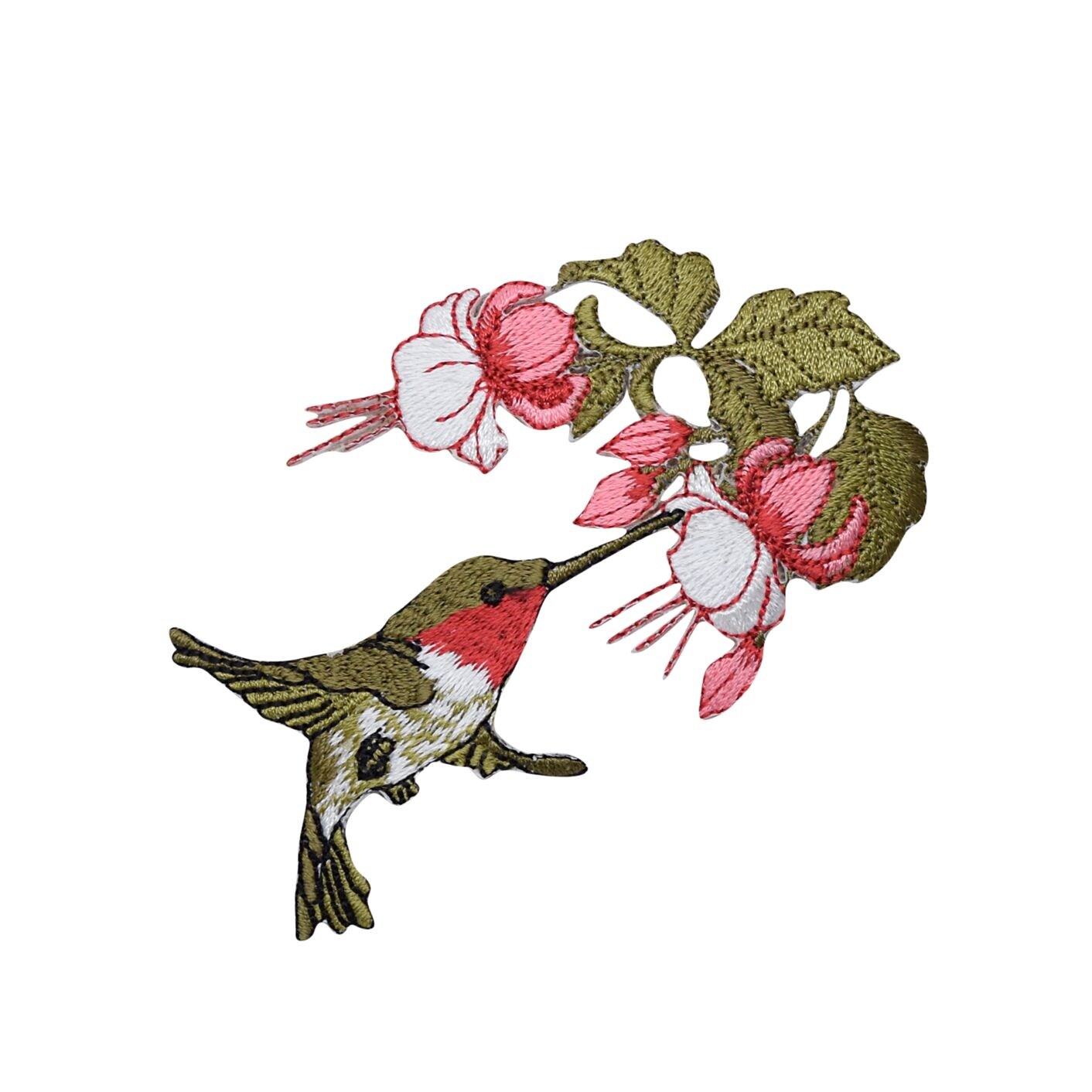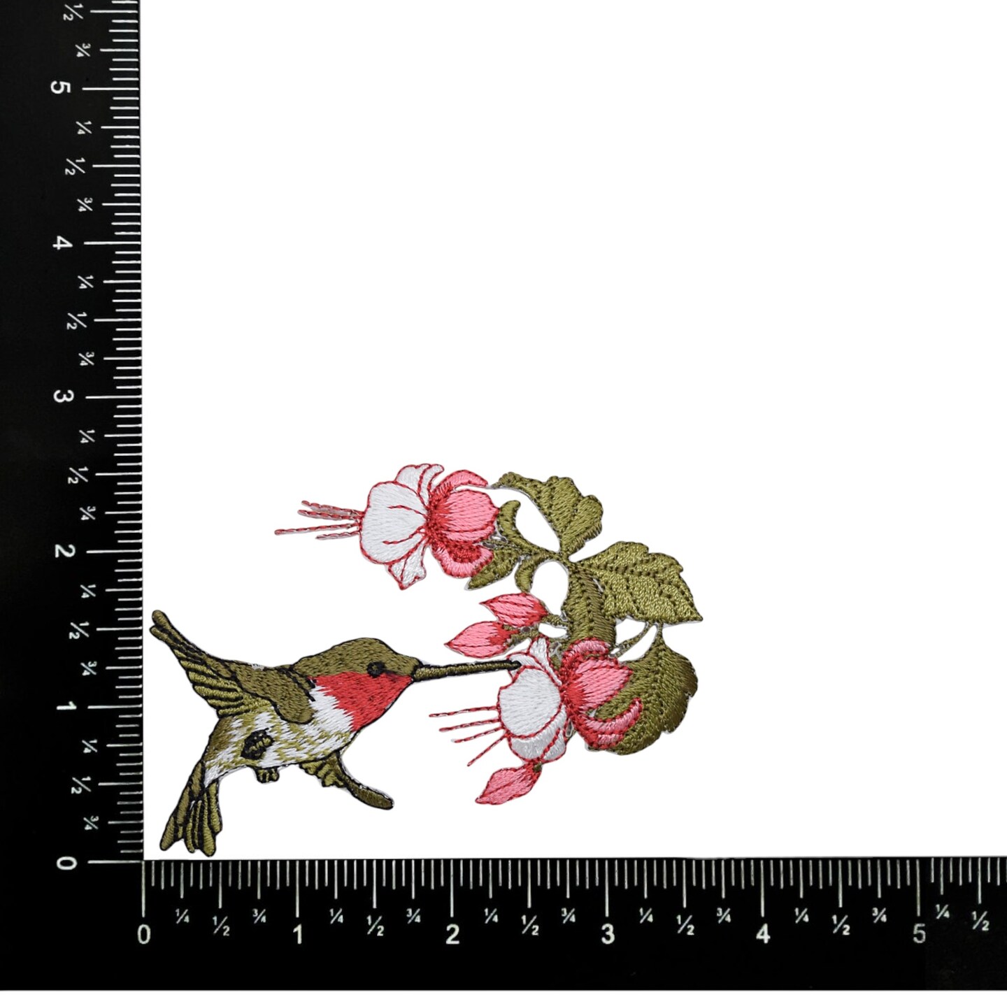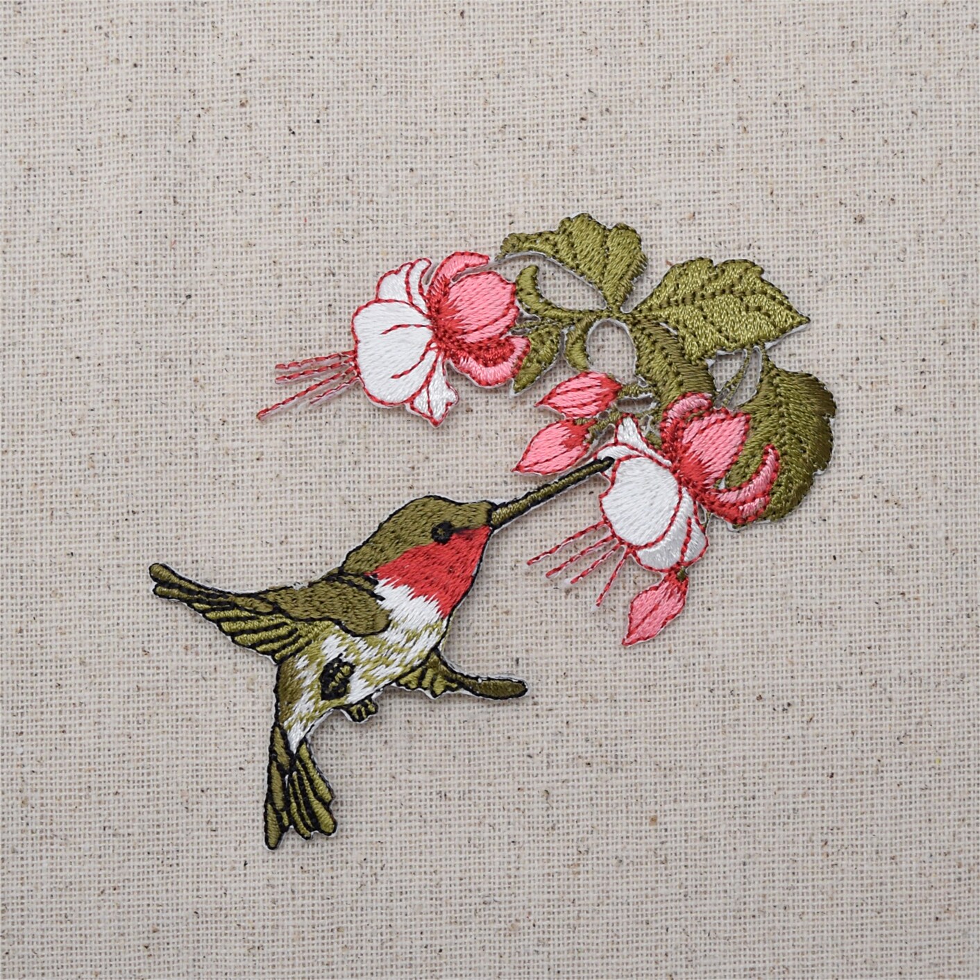 Hummingbird with Pink Flowers, Embroidered, Iron on Patch
