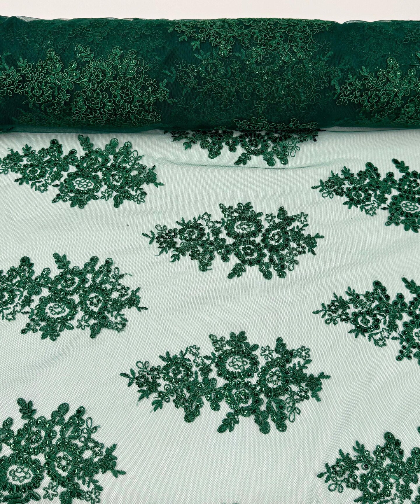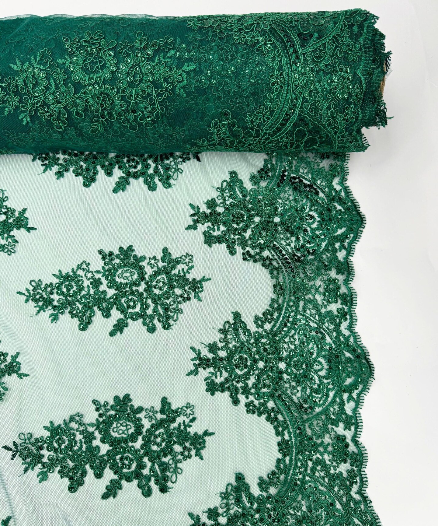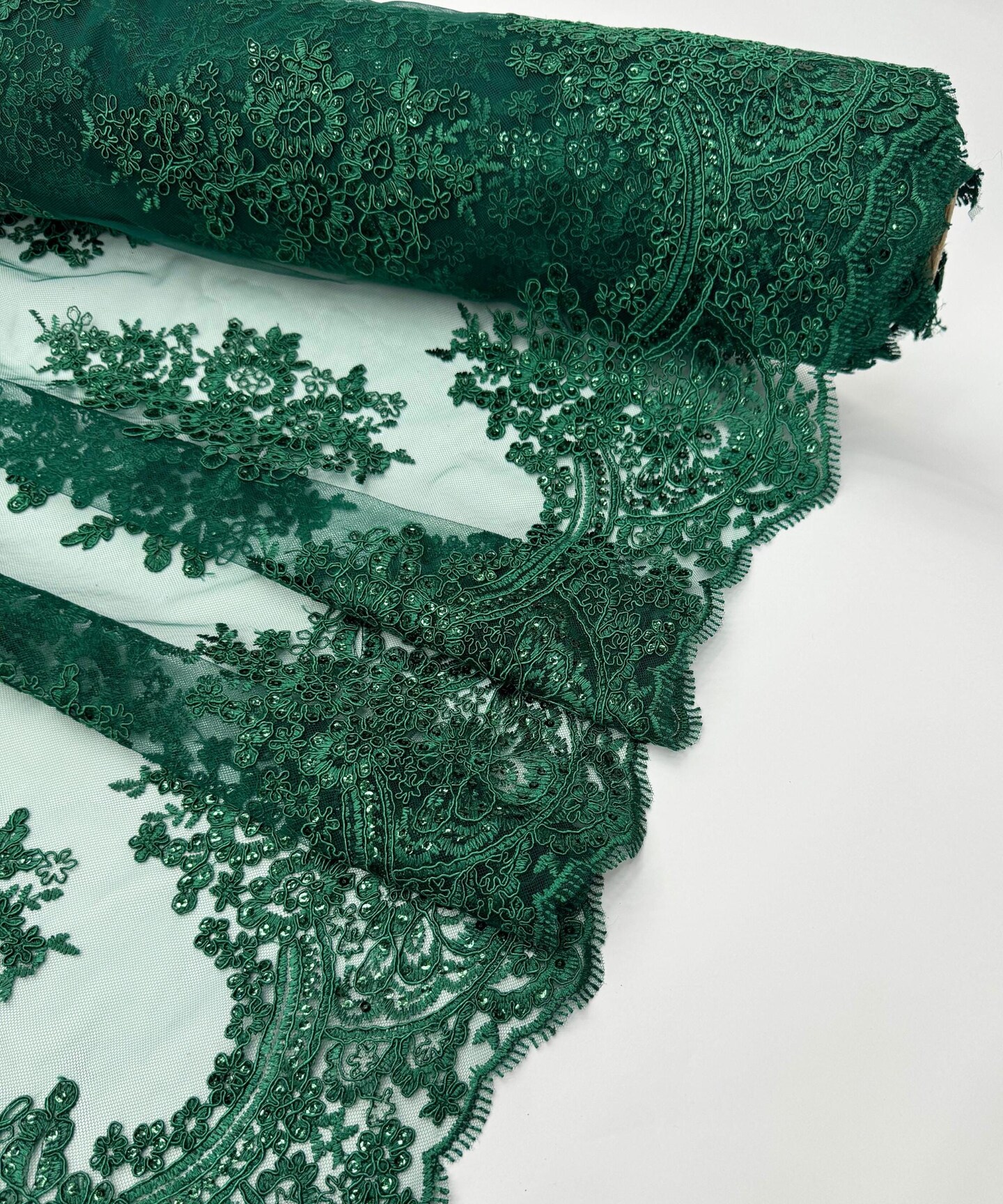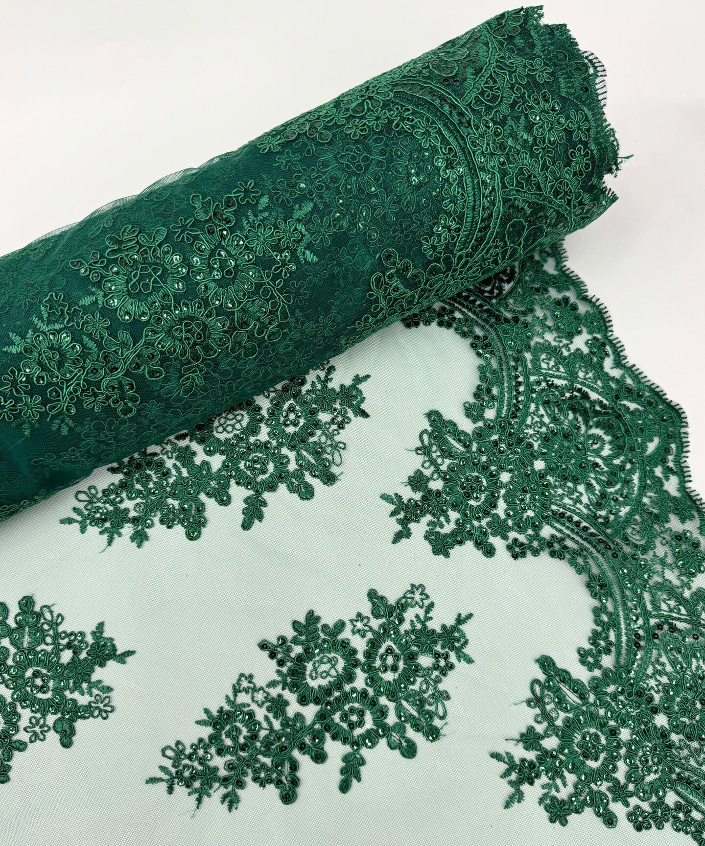 Hunter Green Sequin Embroidered Lace Fabric by the Yard, 54" Wide Floral Mesh Lace with Double Scalloped Edges
