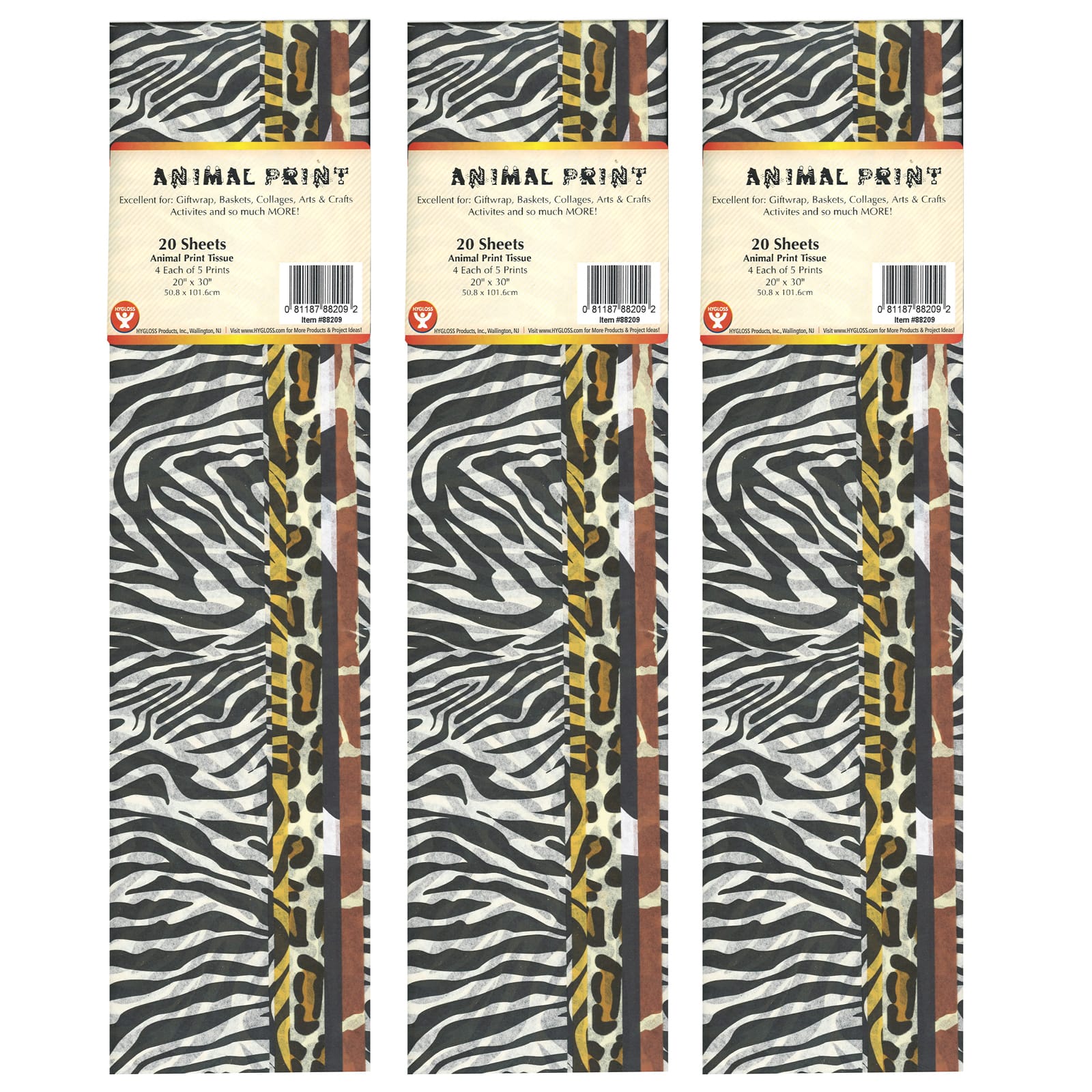 Hygloss Animal Skins Designs Tissue Paper, 3 Packs of 20