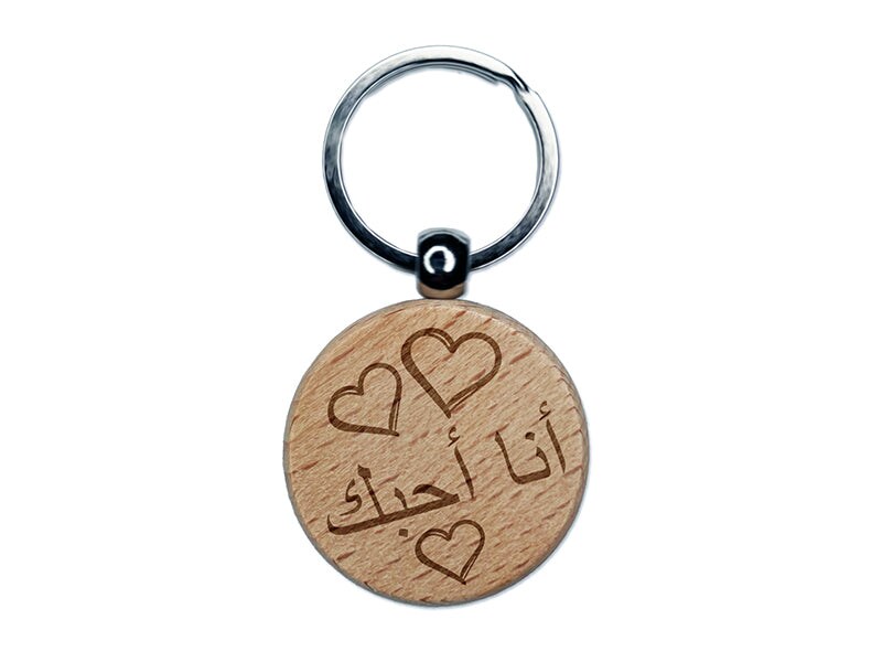 I Love You in Arabic Hearts Engraved Wood Round Keychain Tag Charm