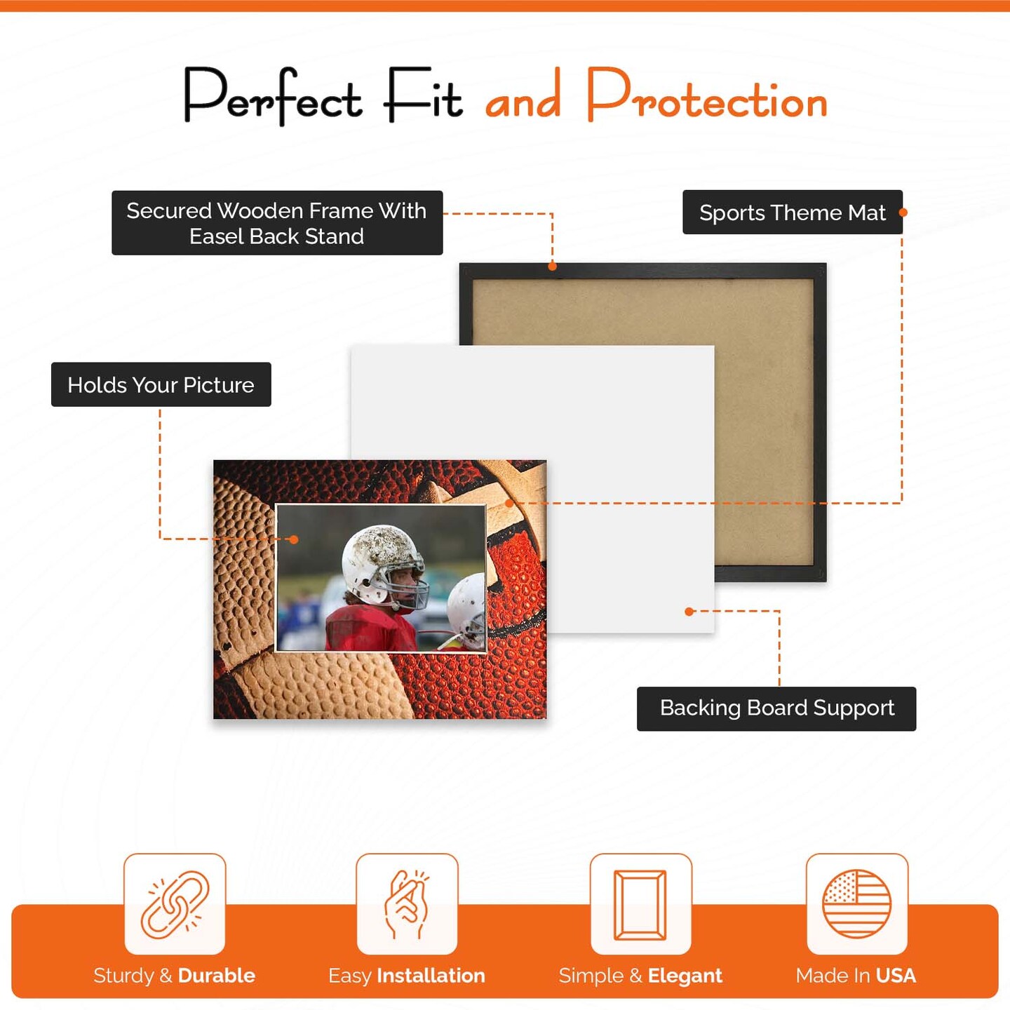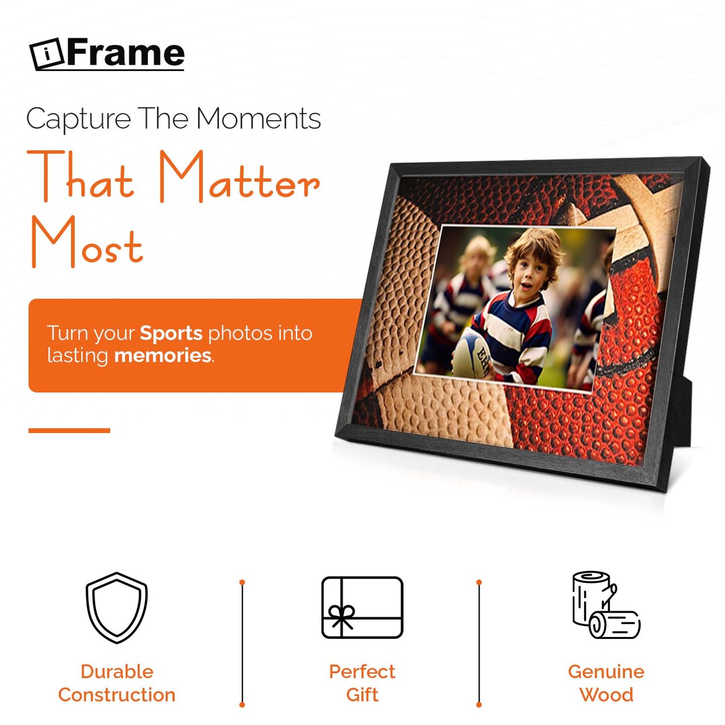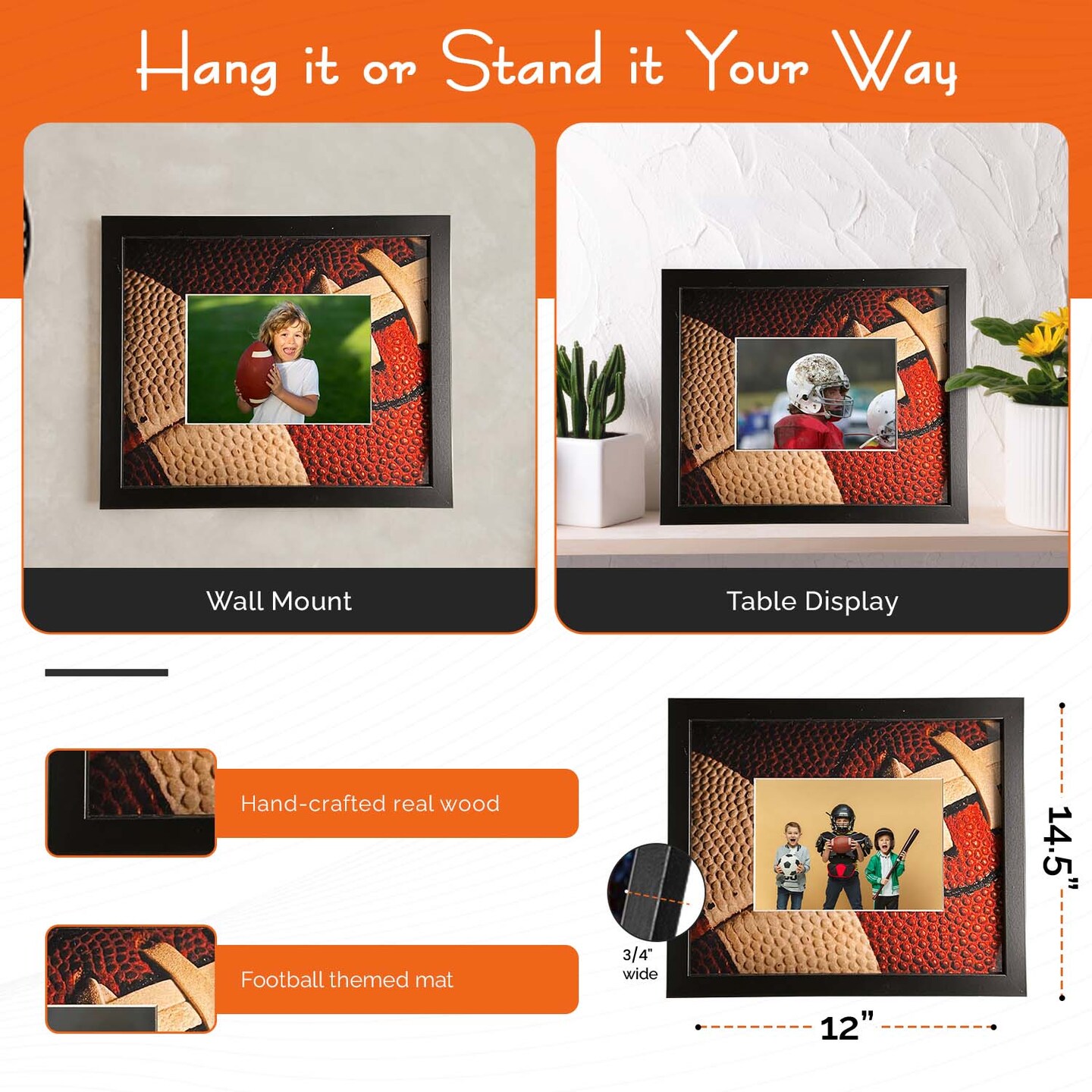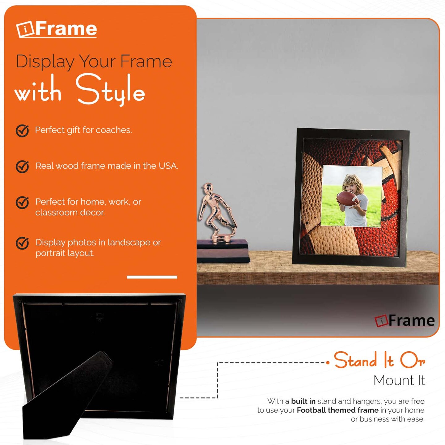 iFrame Commemorative Football Sports Athletics Frame I Fits 5x7 Photograph, Real Wood Black Finish, Desktop, Table Or Wall Mount I Shatterproof Plexiglass I Made in the USA