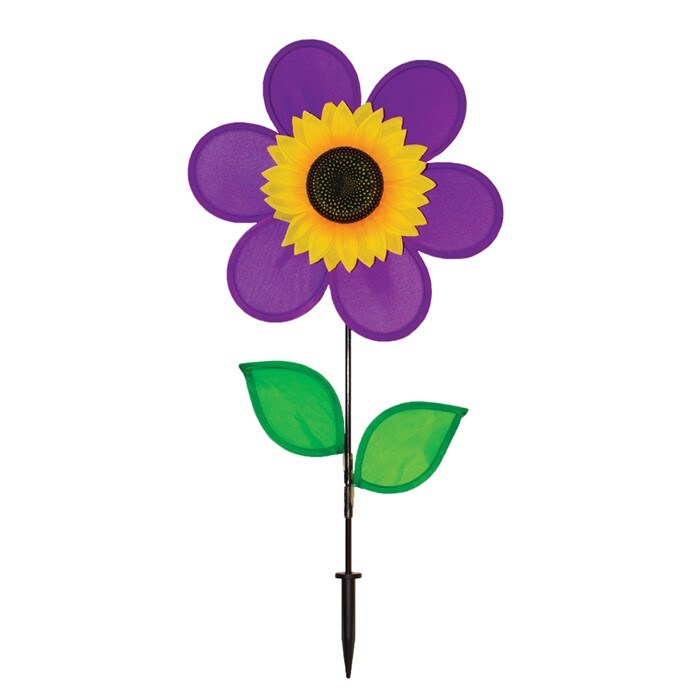In the Breeze 12 Inch Purple Sunflower Wind Spinner with Leaves - Includes Ground Stake - Colorful Flower for your Yard and Garden