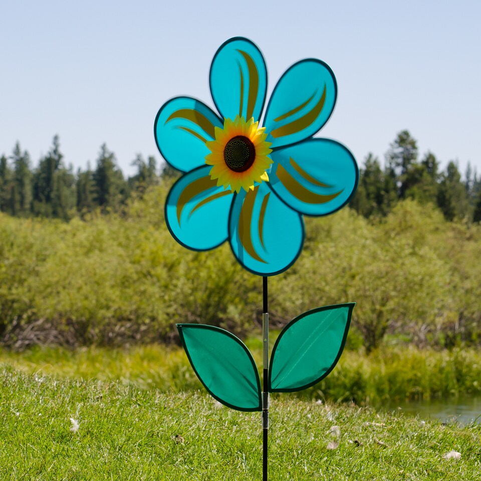 In the Breeze 19 Inch Teal Sunflower Wind Spinner with Leaves - Includes Ground Stake - Colorful Flower for your Yard and Garden