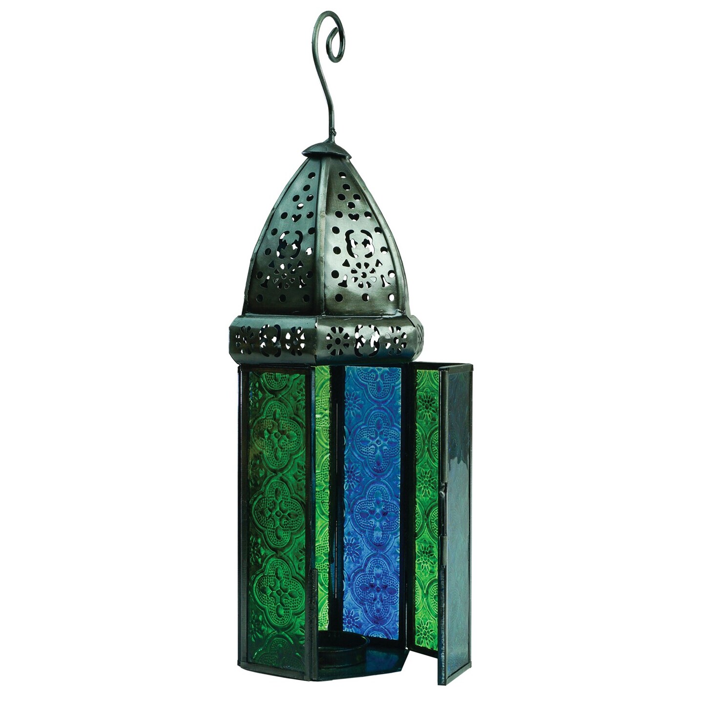 In the Breeze 9212 — Blue & Green Large Hex Tealight Lantern — Moroccan-Style Boho Chic Tealight Glass and Metal Tabletop Lantern