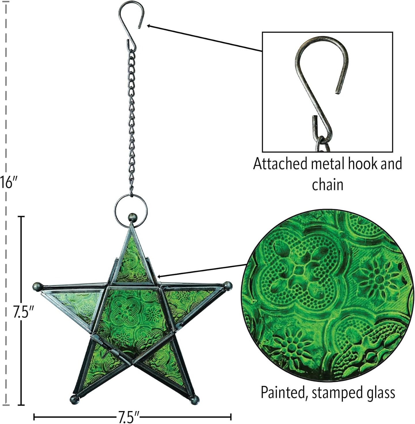 In the Breeze 9218 — Green 5-Point Star Tealight Lantern — Moroccan-Style Boho Chic Glass and Metal Tealight Hanging Lantern