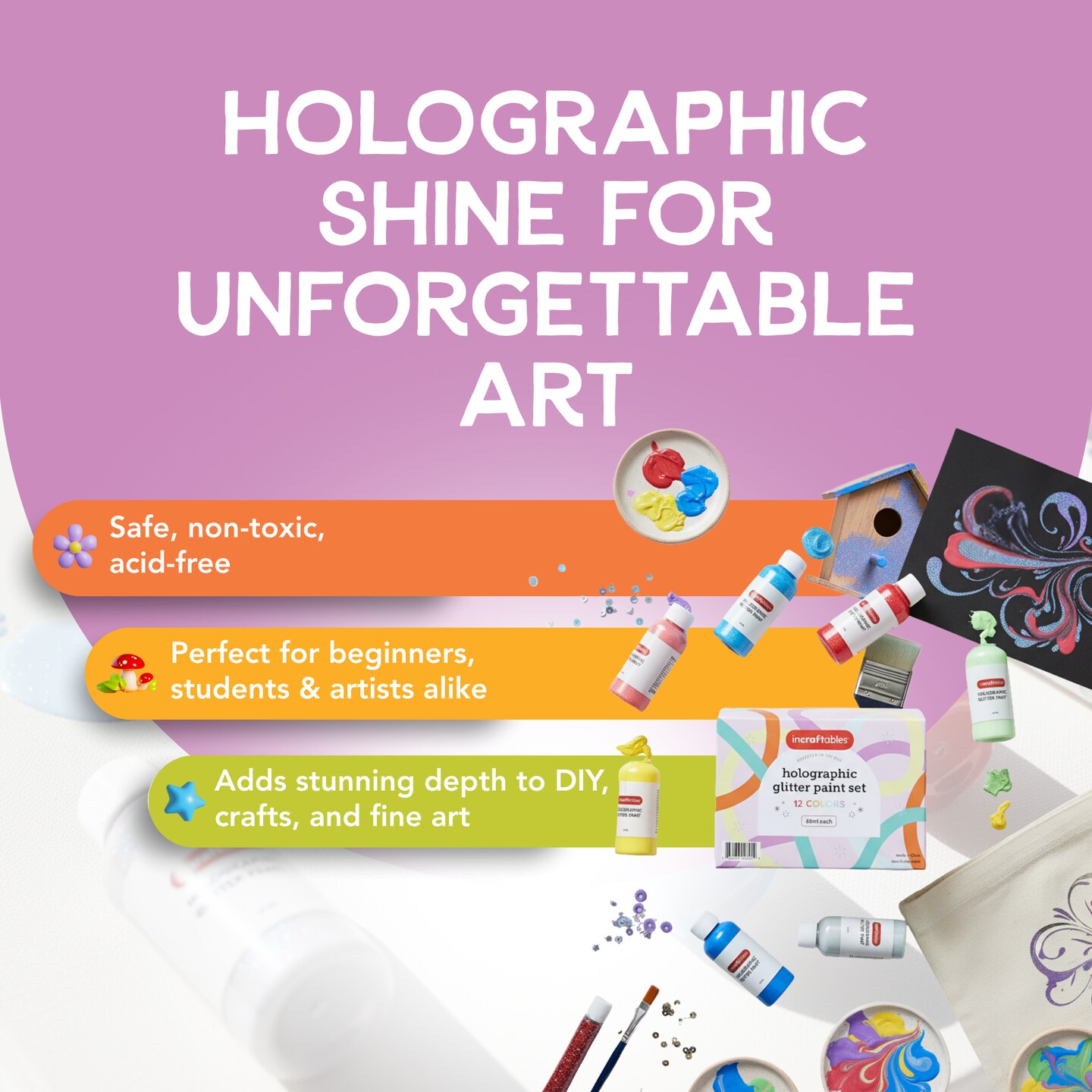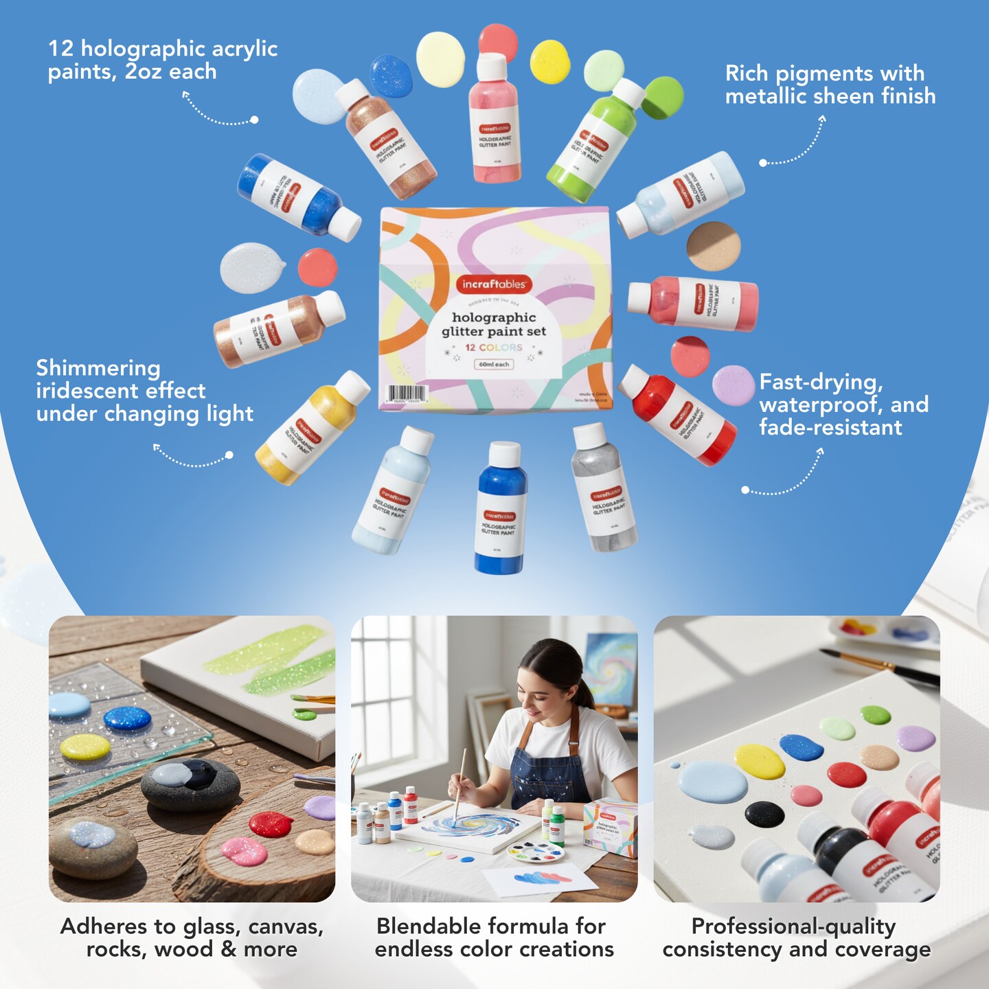 Incraftables Holographic Paint Set (12 Iridescent Colors). Metallic Acrylic Paint for Artists. Non Toxic Chameleon Paint for Canvas, Rocks, Wood, Glitter & Ceramic. Best Color Shift Paint (2 Oz/Color)