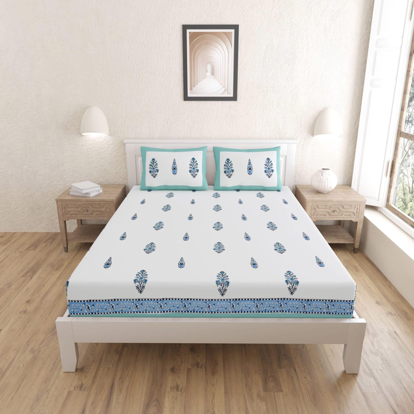 Indian Ethnic Fitted Sheet Set – 150 Thread Count, 100% Cotton, Floral Print, Premium Soft & Breathable Bedding (King, Queen)