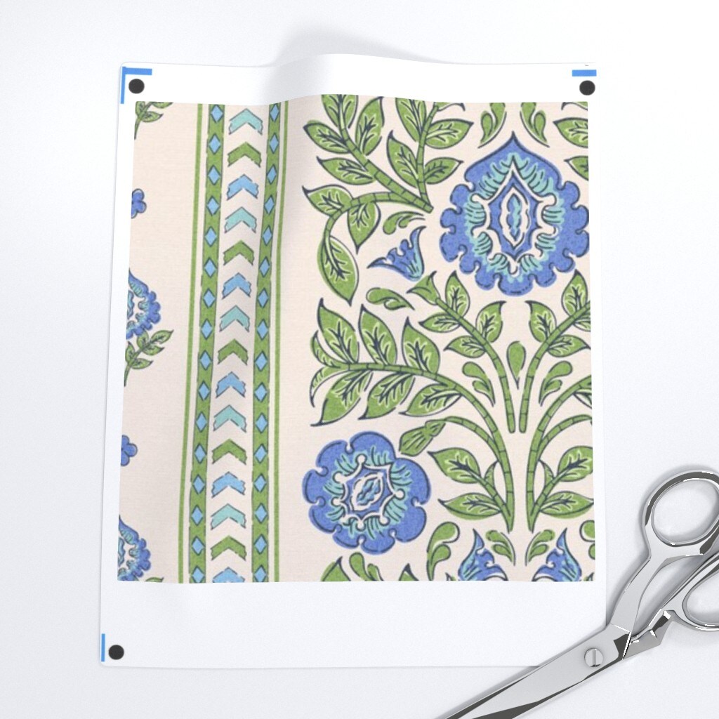 Indian Floral Blue Flowers Green Botanical Traditional Large Scale Stamped Stripes Custom Printed Fabric by Spoonflower Various Fabrics by the Yard or Fat Quarter