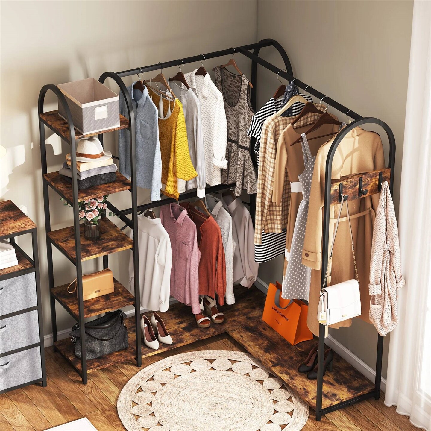 Industrial L Shaped Corner Closet Organizer with Shelves and Garment Rods for Bedroom Storage