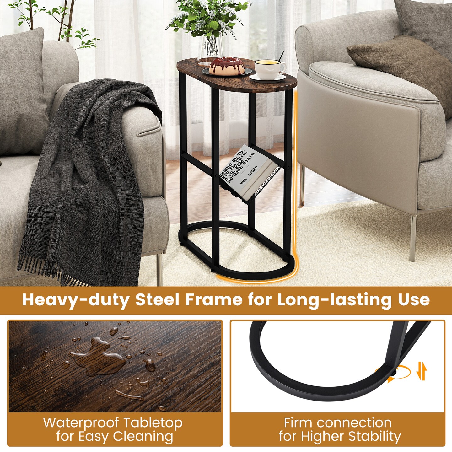 Industrial Oval Side Table with 2-Tier Mesh Storage