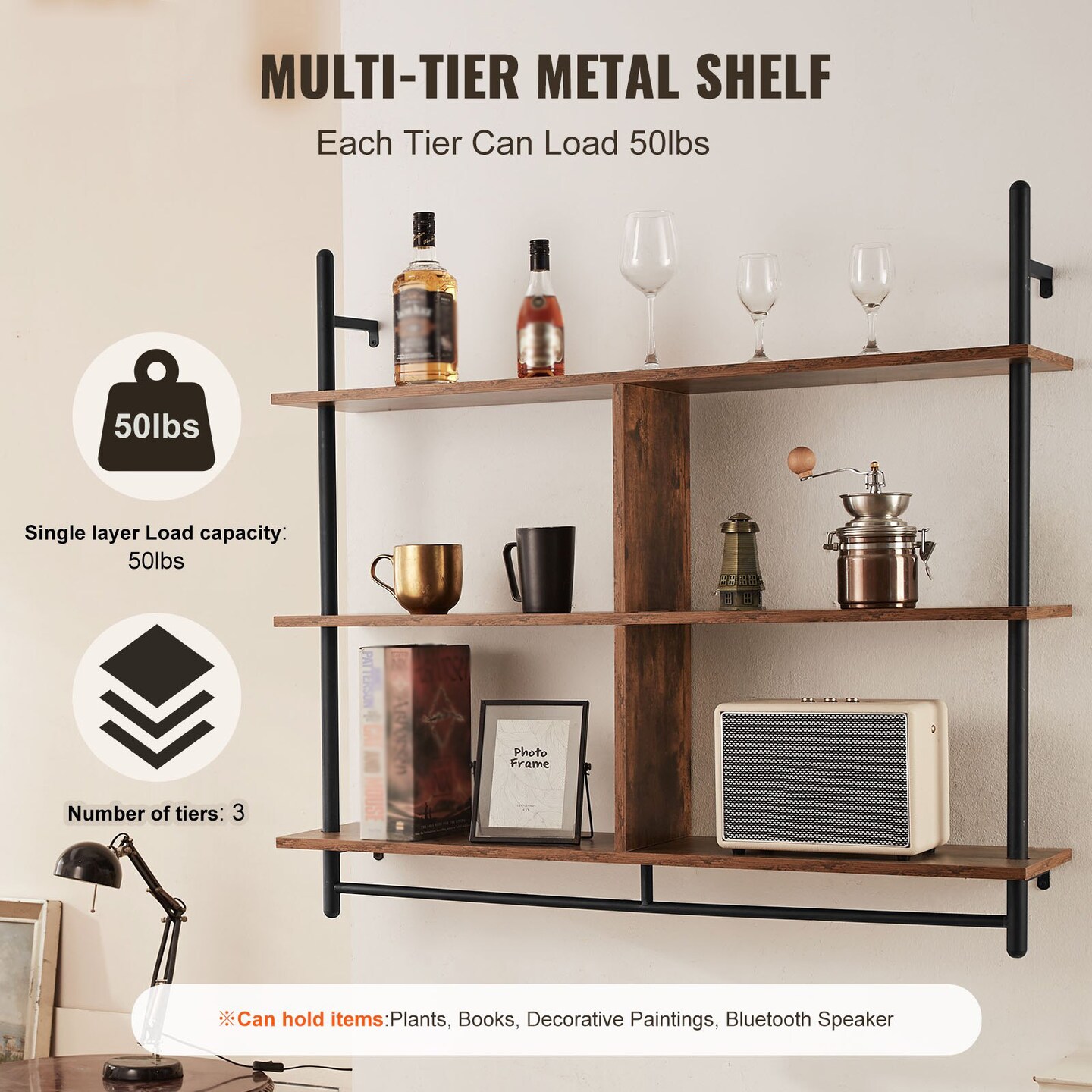 Industrial Pipe Shelf 3 Tier Wall-Mount Rustic Floating Storage Rack