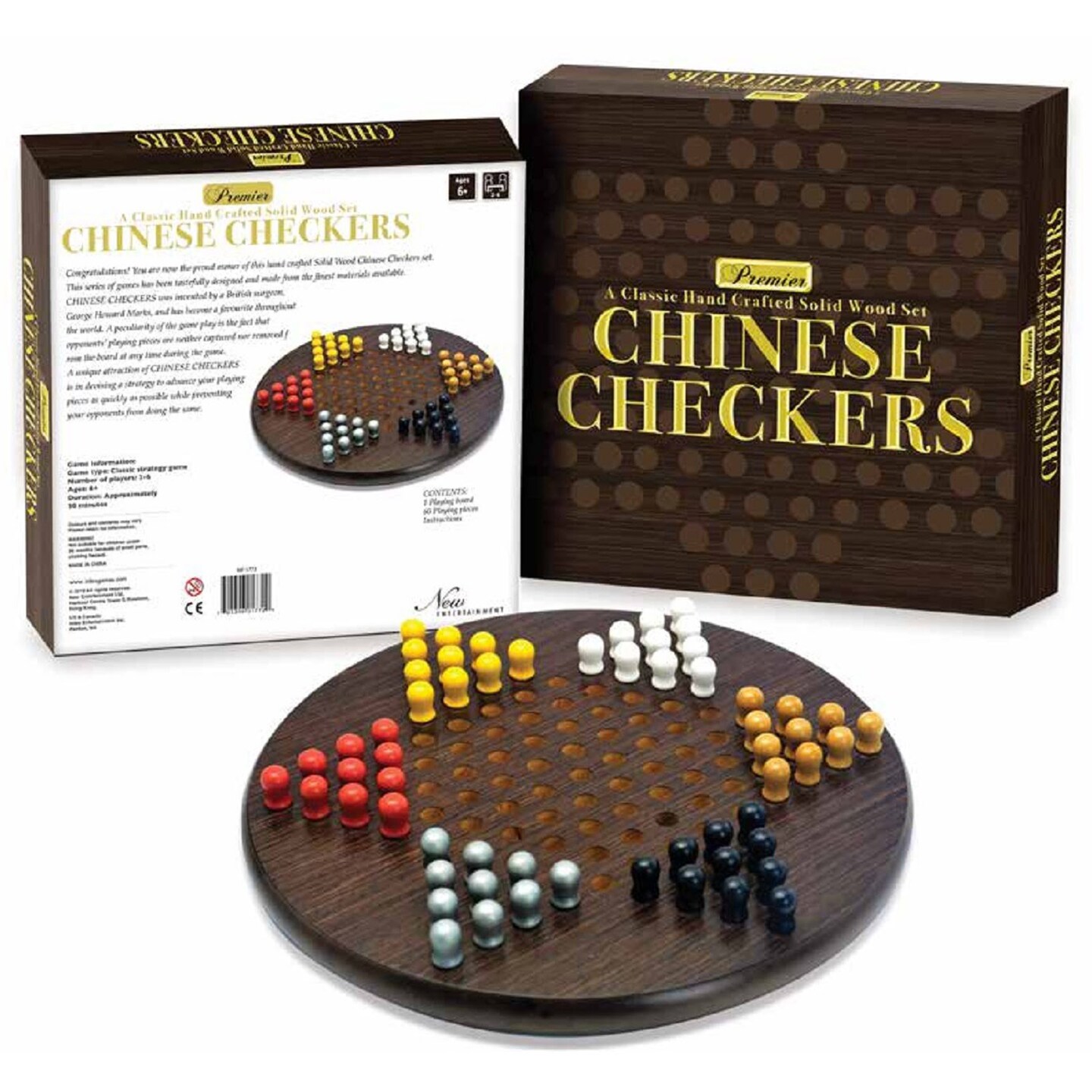 Intex Entertainment Premier Chinese Checkers - Solid Beech Wood Board, Dark Stained Rosewood, Colorful Pegged Pieces, Strategy Game for Ages 6+