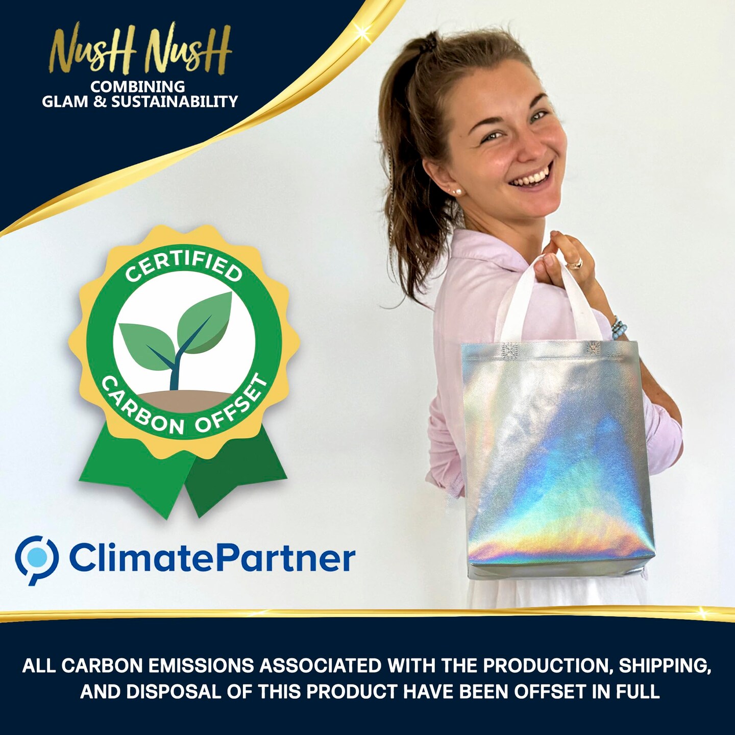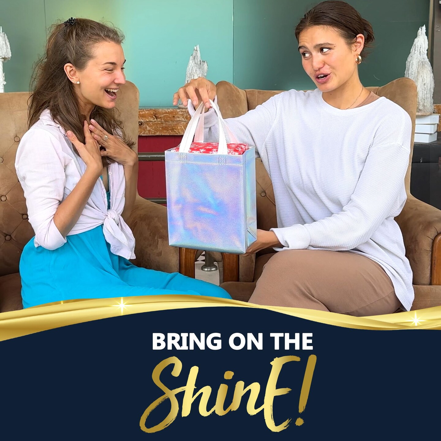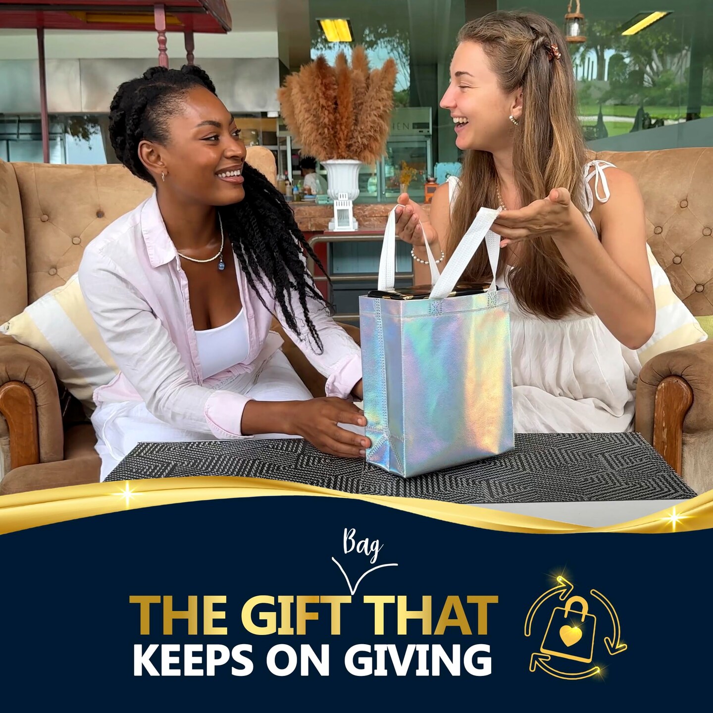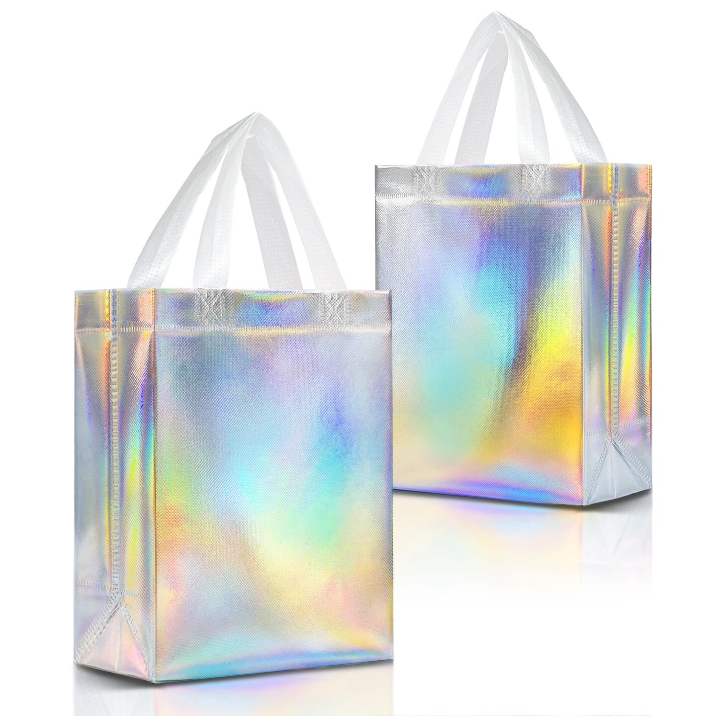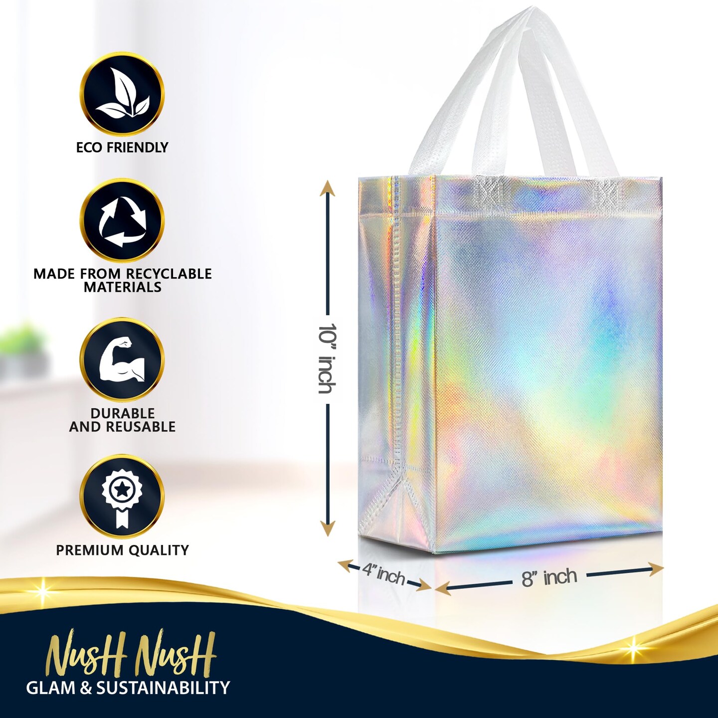 Iridescent Gift Bags Medium Size – Set of 12 Holographic Silver Reusable Gift Bags With Handles - Ideal Goodie Bag for Birthday, Bachelorette Party Favors, Baby Shower, Return Gifts – 8x4x10