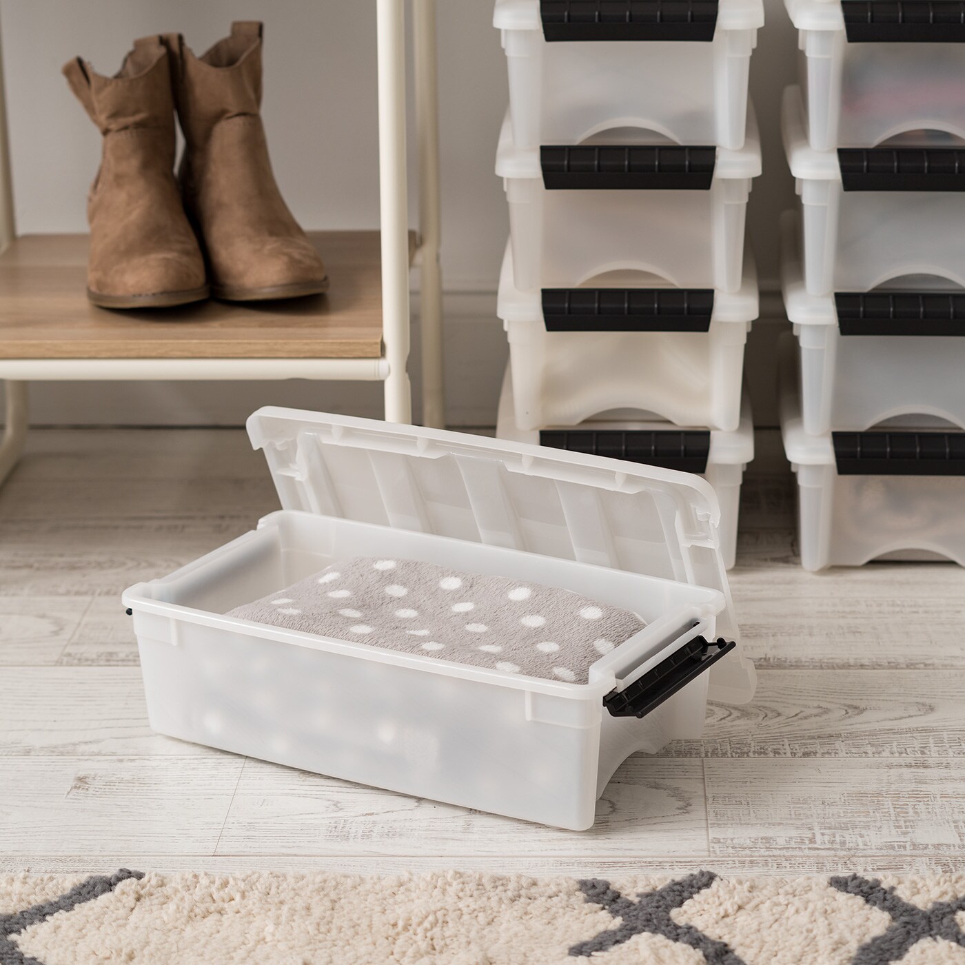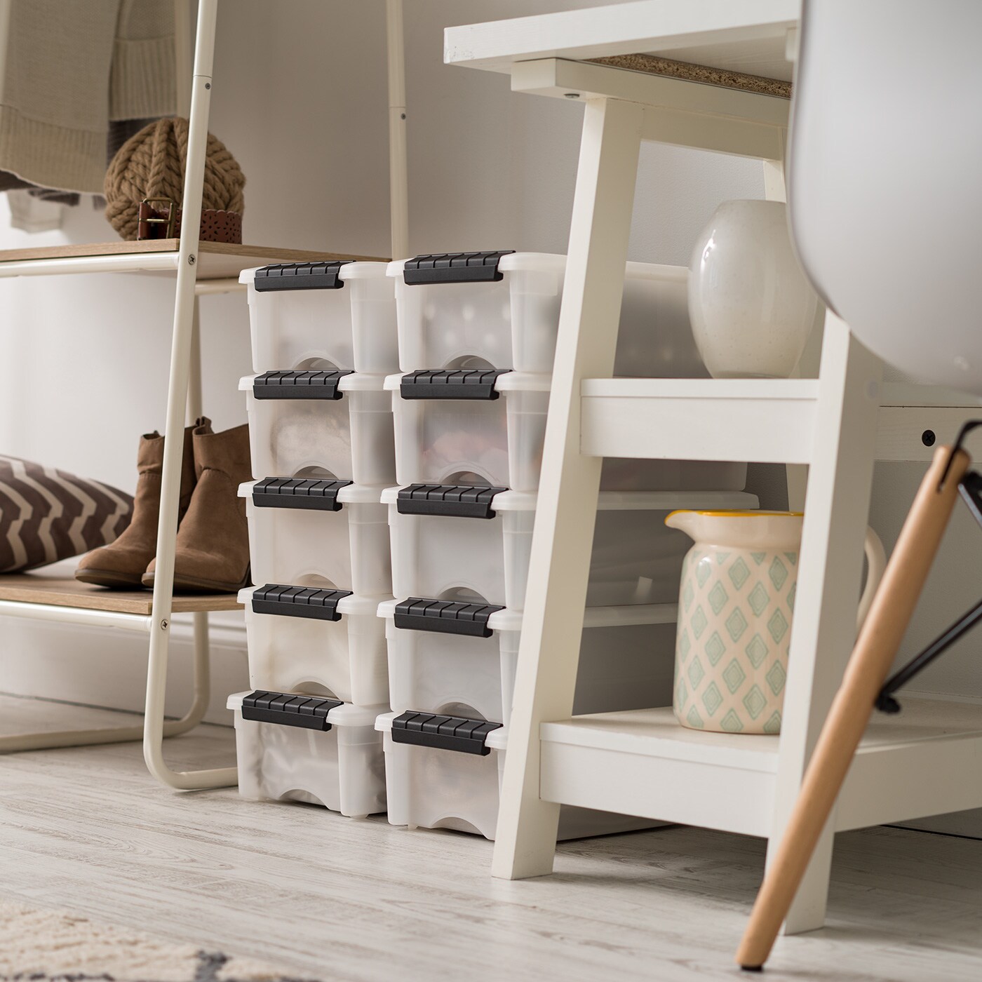 IRIS USA 6 Qt Stackable Plastic Storage Bins with Lids, 10 Pack, Made in USA - Discreet Organizing Solution, Latches, Durable Nestable Containers, Secure Pull Handle - Pearl