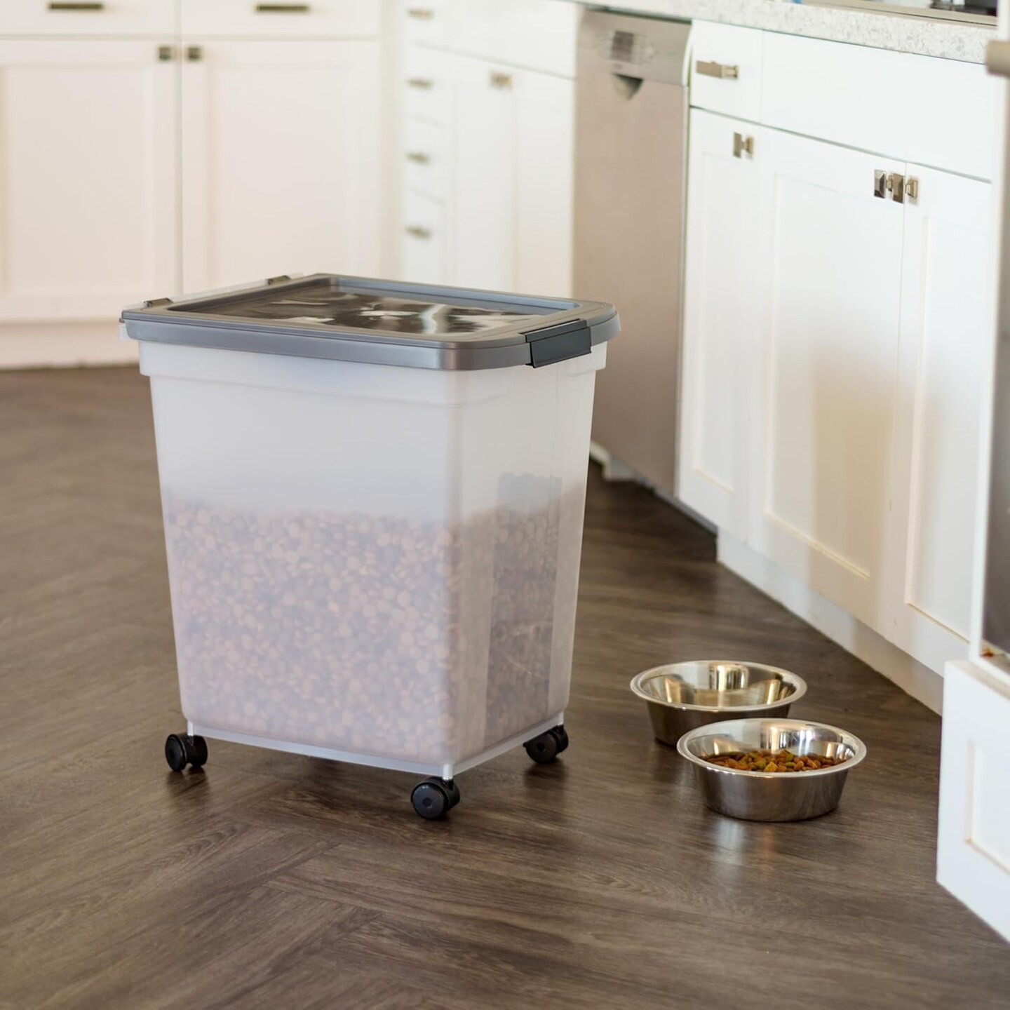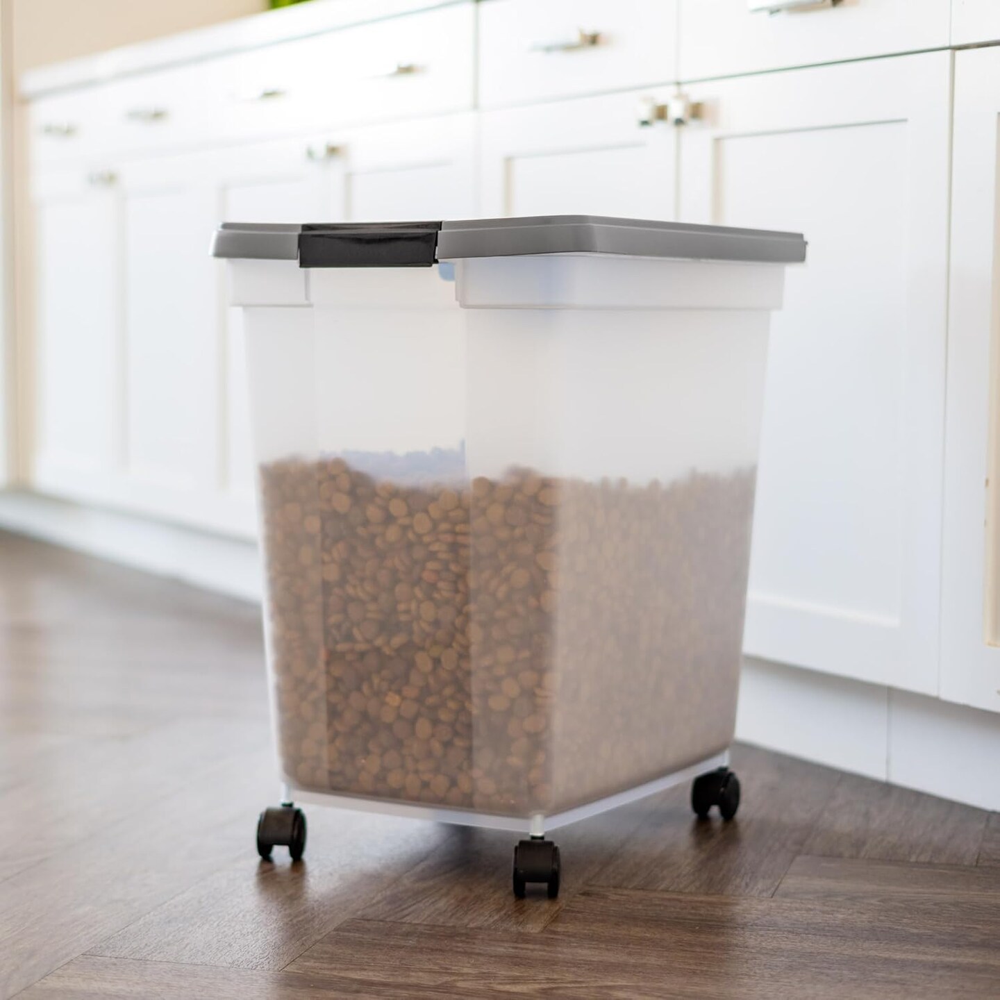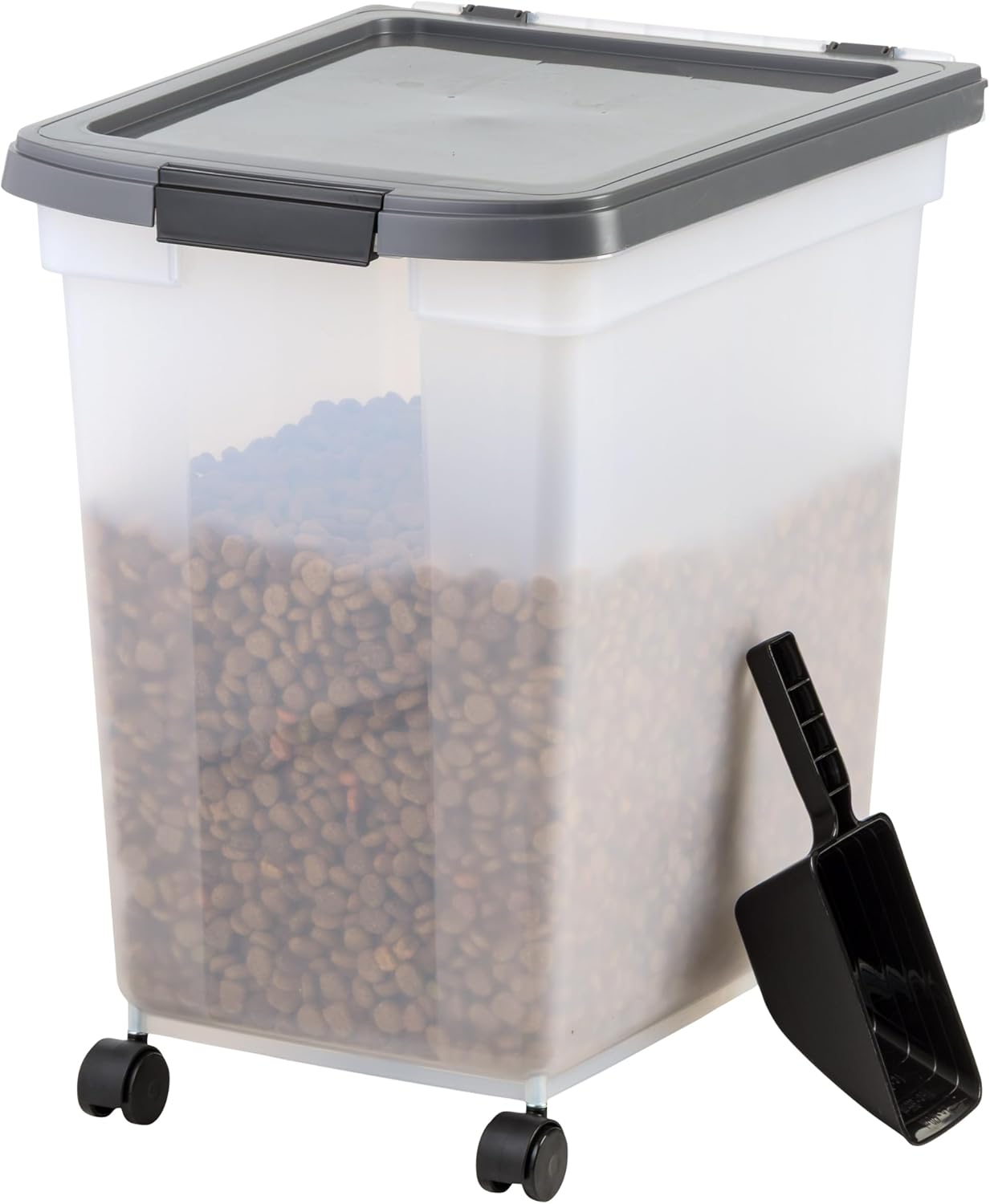 IRIS USA Dog Food Storage Container 50 lbs, with Removable Rolling Wheels & Included Scoop, for Dog Cat Bird and Other Pets, Clear/Dark Gray