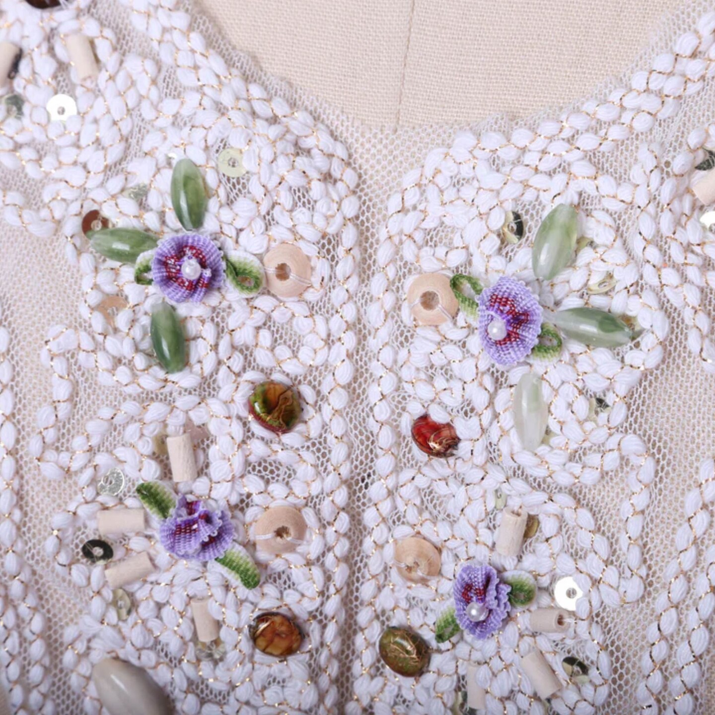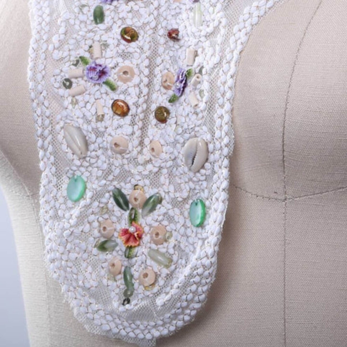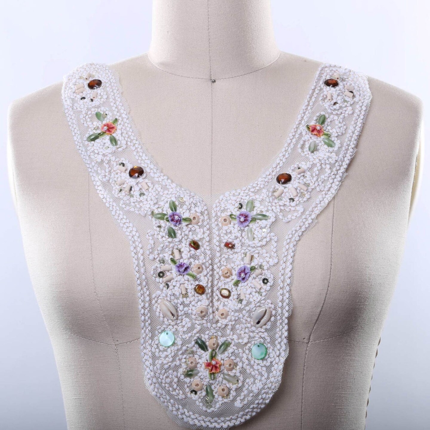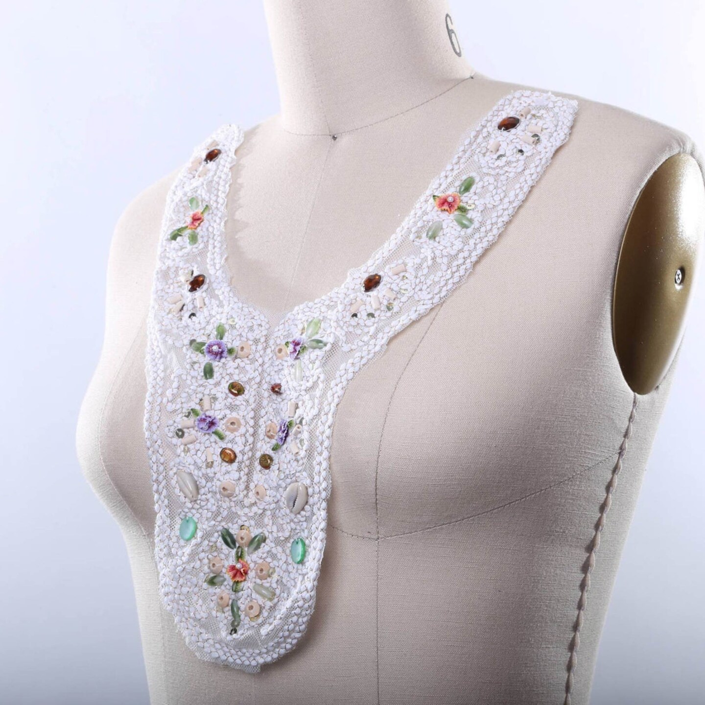 Ivory Lace Bib Collar Patch with Purple Flowers and Crystals for Dresses Costumes