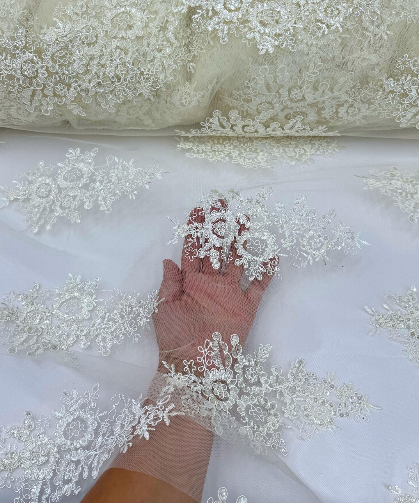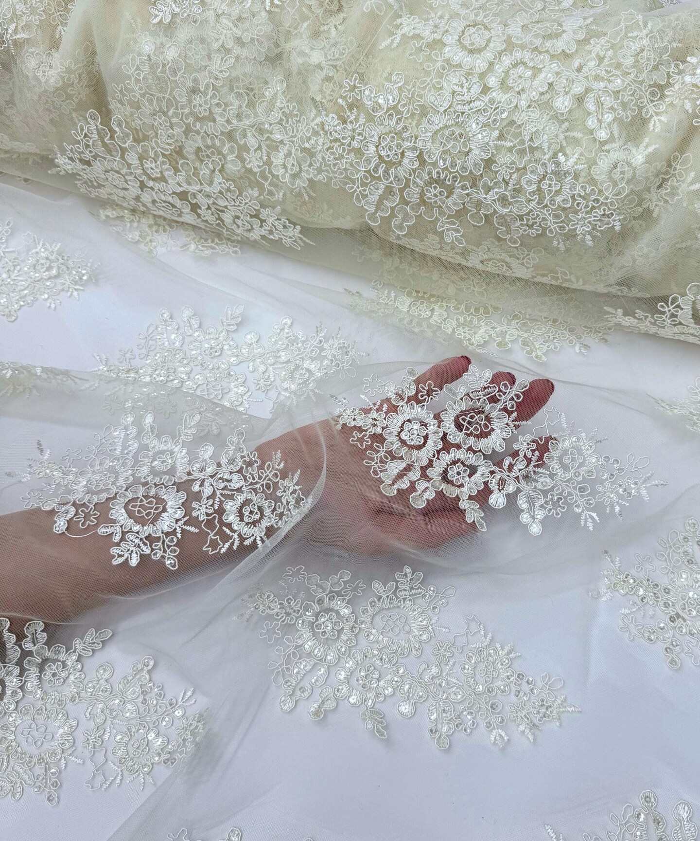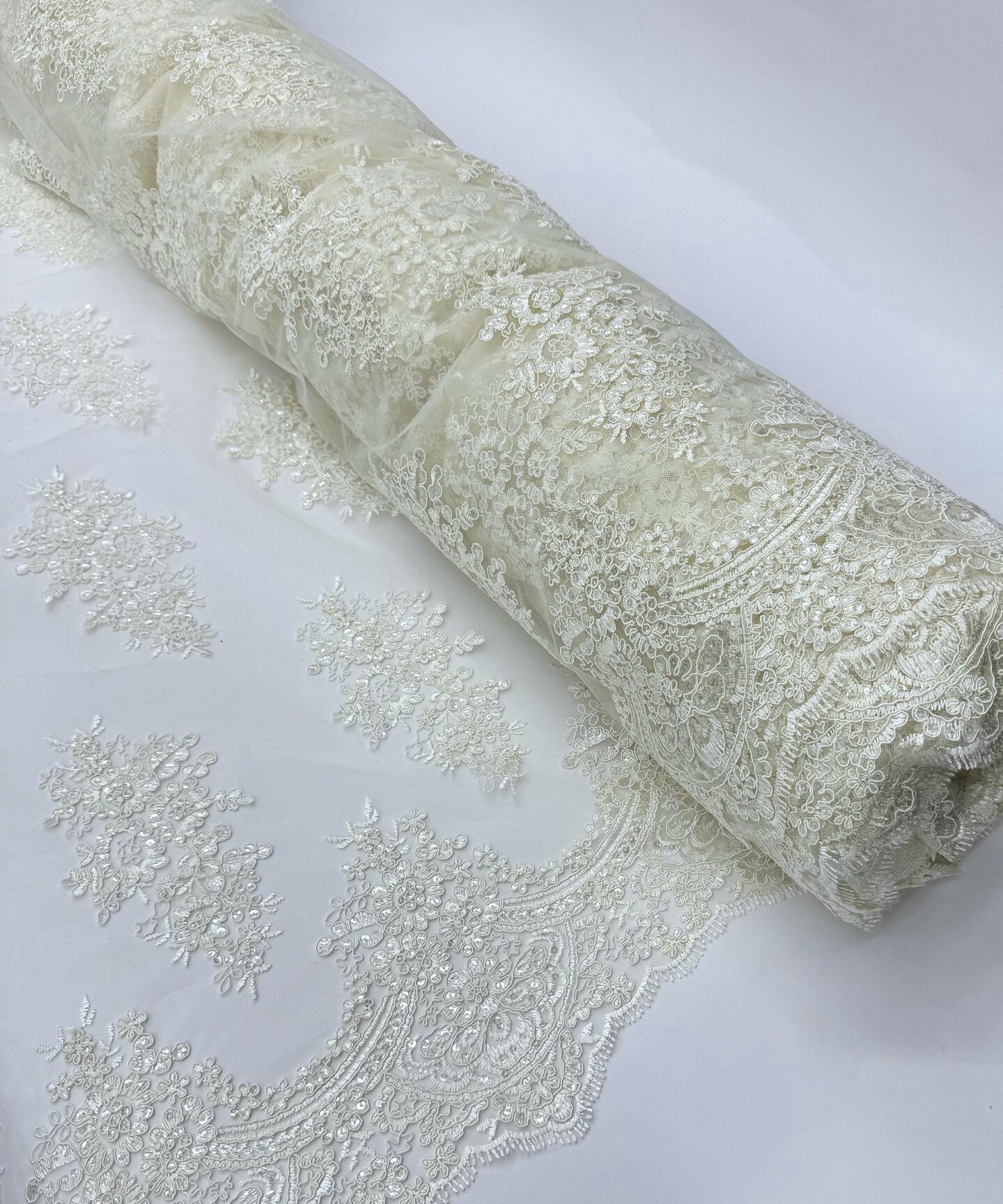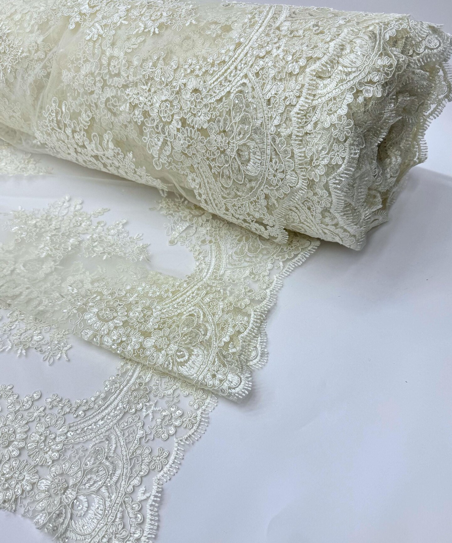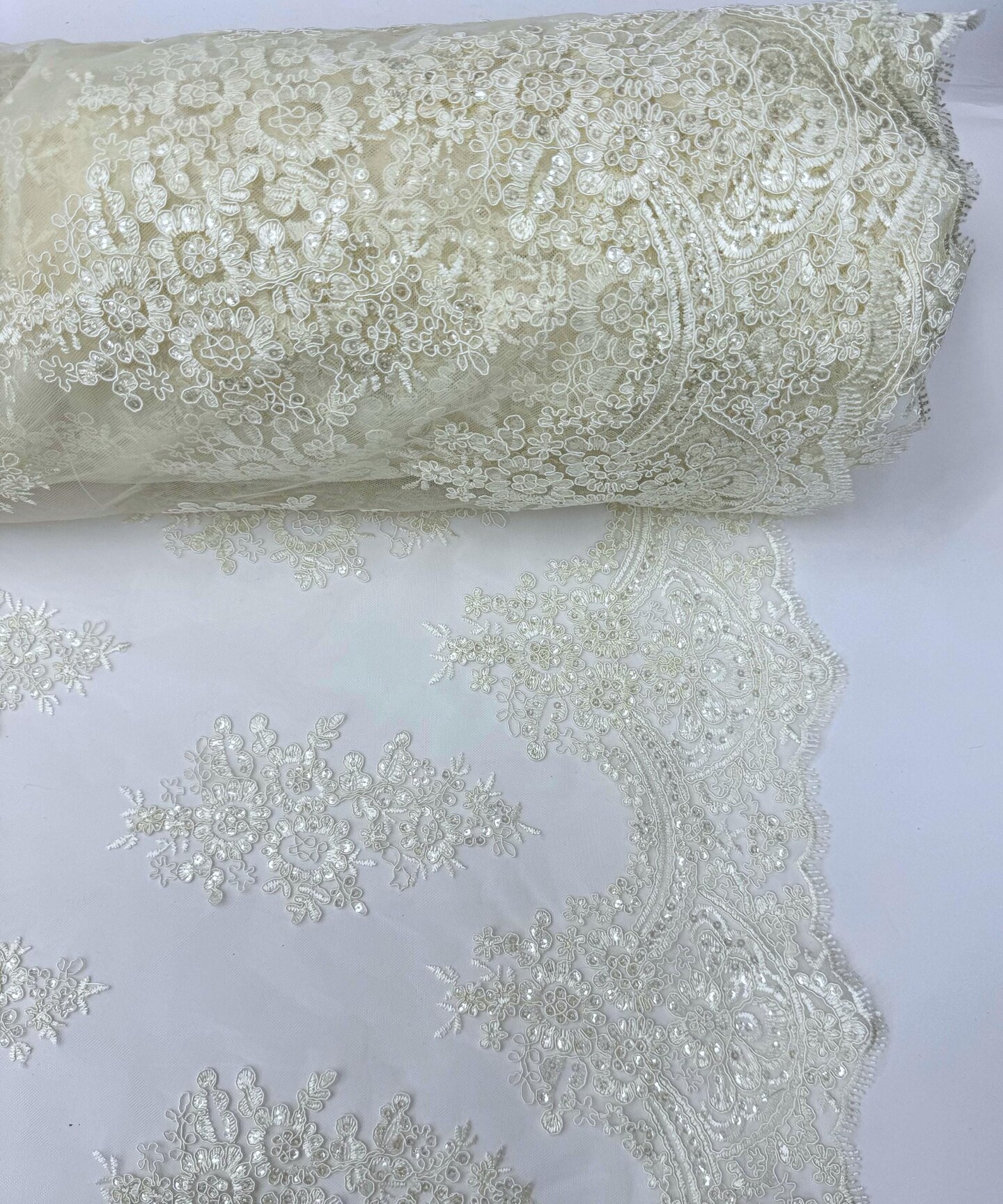 Ivory Sequin Embroidered Lace Fabric by the Yard, 54" Wide Floral Mesh Lace with Double Scalloped Edges