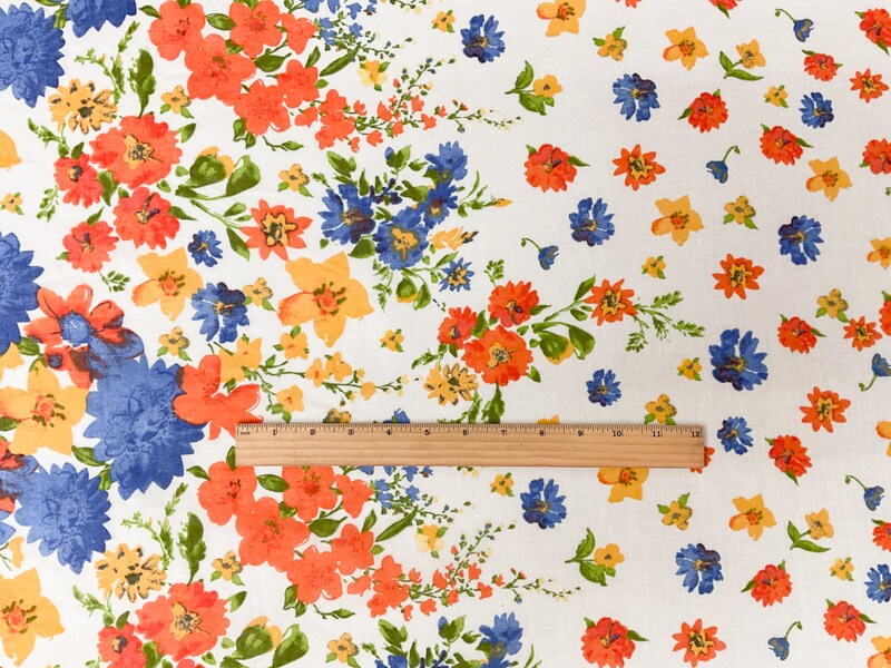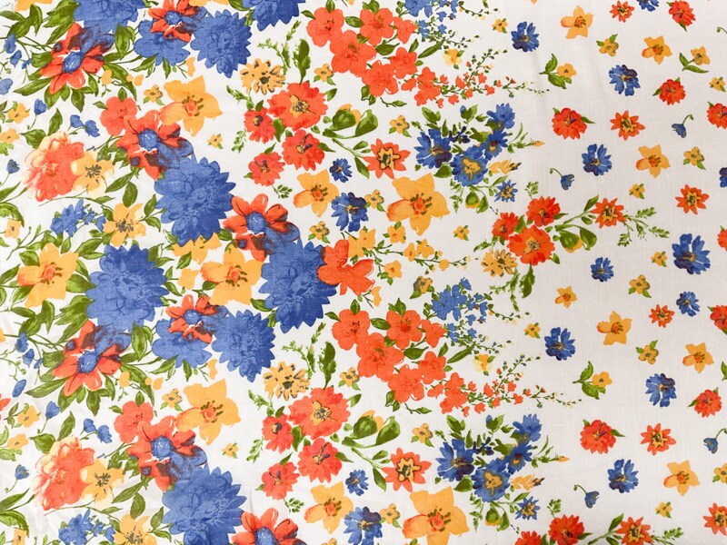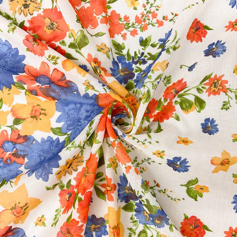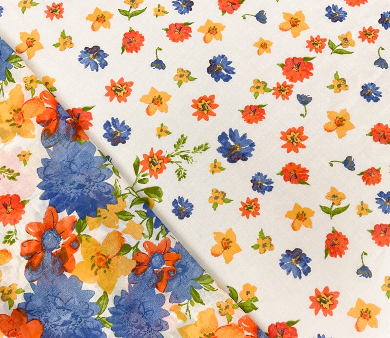 Ivory-Blue-Multi Cotton Floral Border Printed Gauze Woven Fabric By the Yard