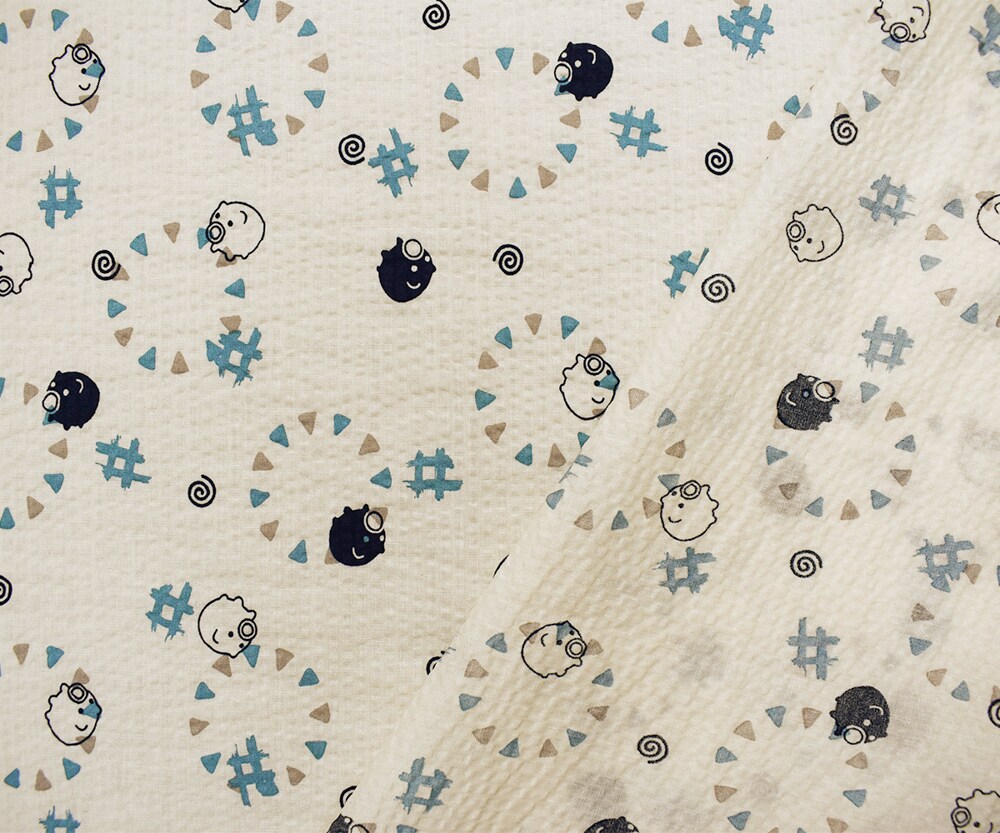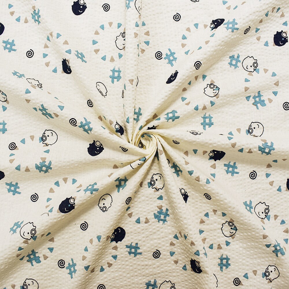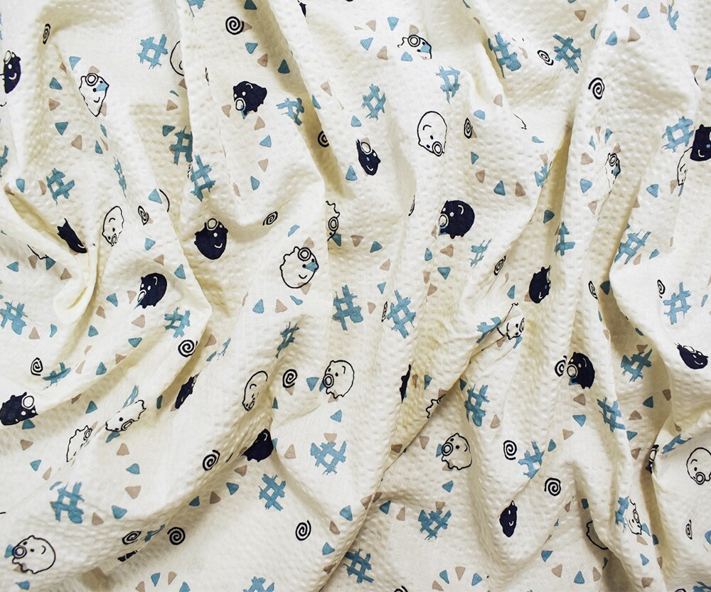 Ivory-Navy-Multi Japanese Cotton Abstract Pig Printed Plisse Woven Fabric By the Yard