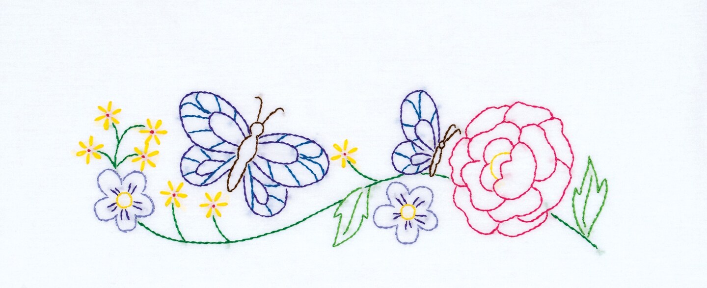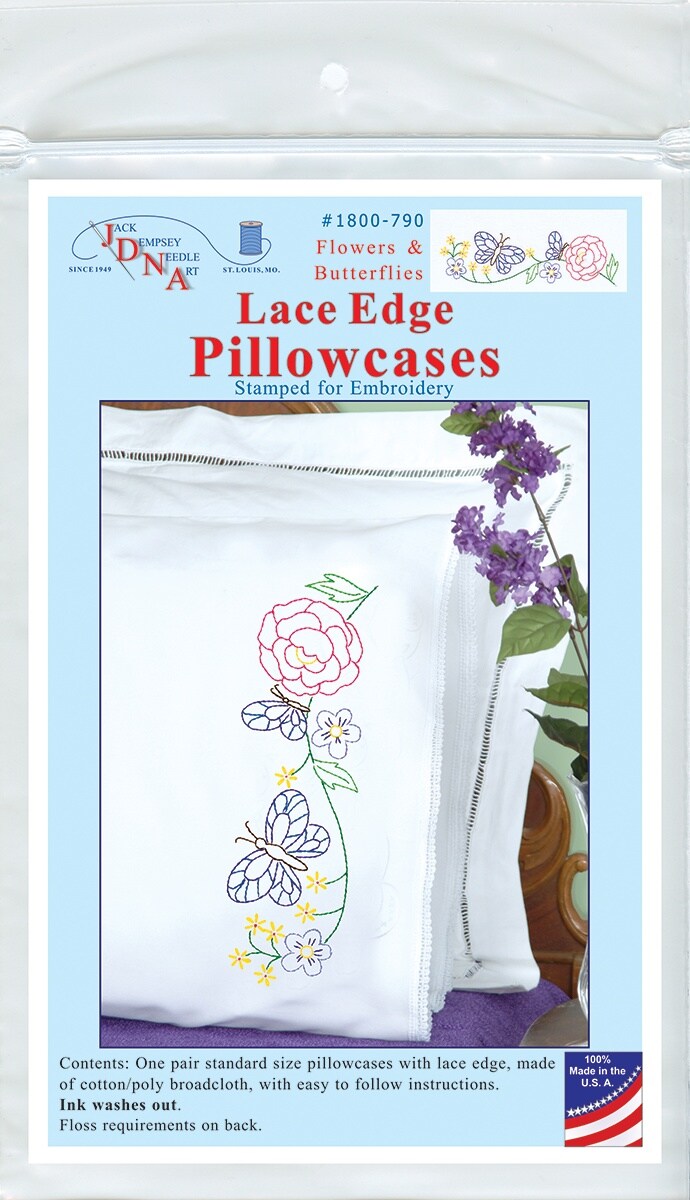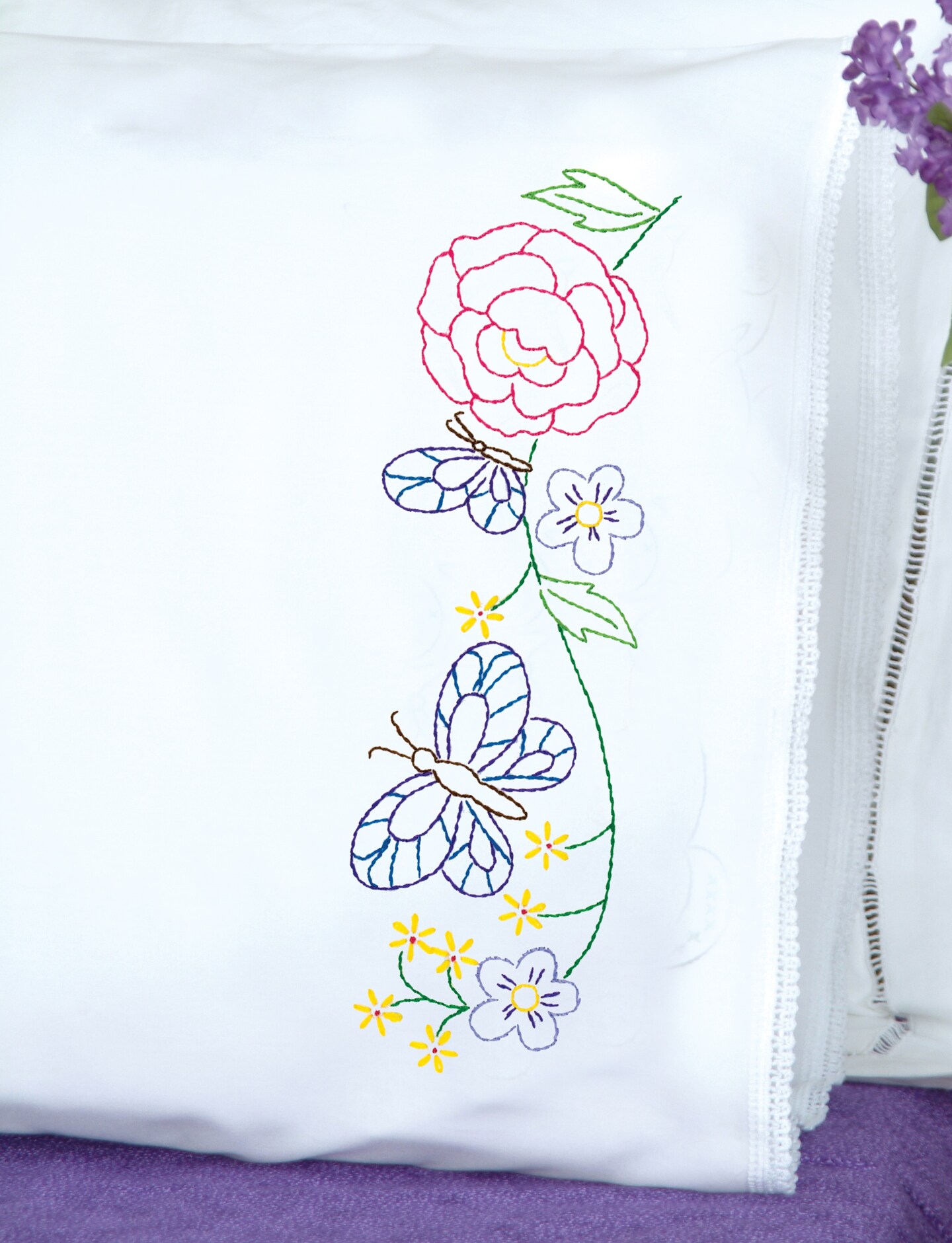 Jack Dempsey Stamped Pillowcases W/White Lace Edge 2/Pkg-Flowers & Butterflies