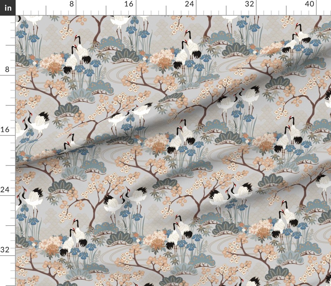 Japanese Garden Cranes Sakura Blossoms Cherry Trees Sashiko Pattern Custom Printed Fabric by Spoonflower Various Fabrics by the Yard or Fat Quarter